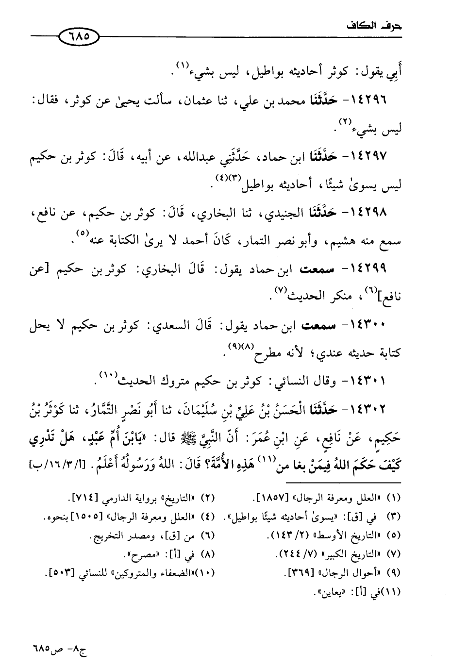 14299 - سمعتُ ابن حماد يقول: قال البُخاري: كوثر بن حكيم عن نافع، منكر الحديث.