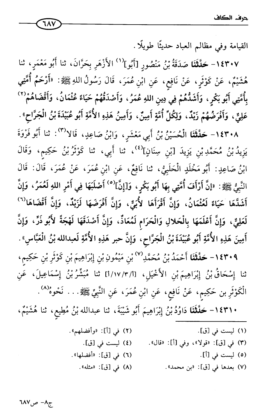 14307 - حَدثنا صدقة بن منصور أَبو الأزهر بحران، حَدثنا أَبو معمر، حَدثنا هشيم، عن كوثر، عن نافع، عن ابن عُمر، قال رسول الله صَلى الله عَليه وسَلم: أرحم أُمَّتِي بأمتي أَبو بكر، وأشدهم في دين الله عُمر، وأصدقهم حياء عثمان، وأفضلهم علي، وأفرضهم زيد، ولكل أمة أمين، وأمين هذه الأمة أَبو عبيدة بن الجراح.