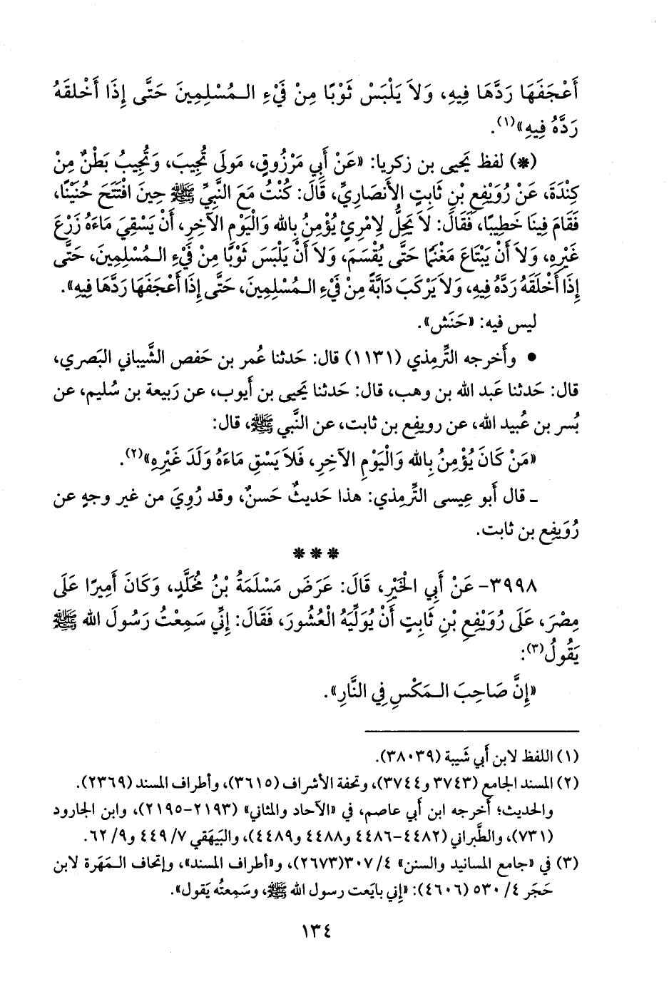 - وأخرجه التِّرمِذي (١١٣١) قال: حدثنا عمر بن حفص الشيباني البصري، قال: حدثنا عبد الله بن وهب، قال: حدثنا يحيى بن أيوب، عن ربيعة بن سليم، عن بُسر بن عُبيد الله، عن رويفع بن ثابت، عن النبي صَلى الله عَليه وسَلم قال: