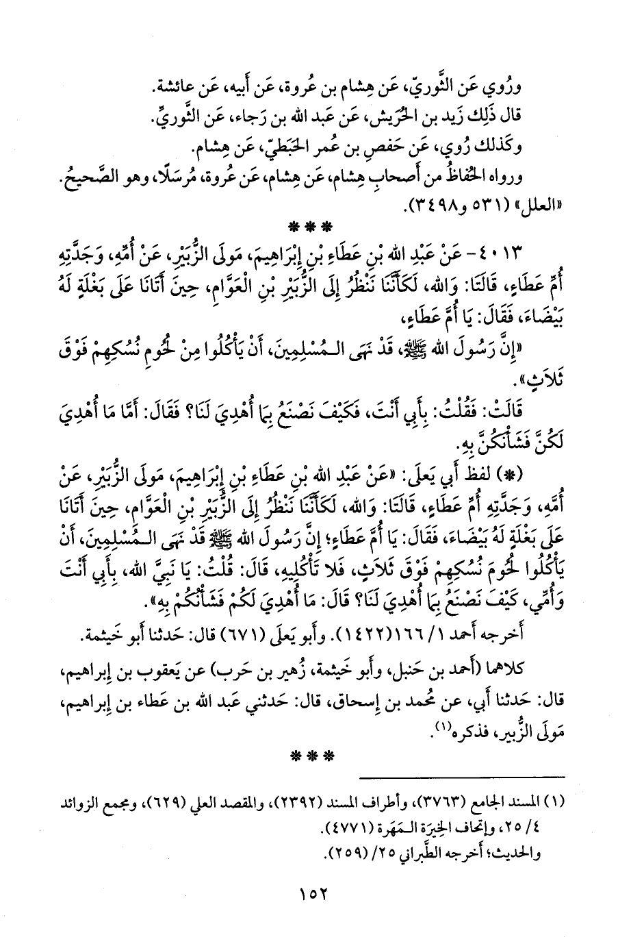 - لفظ أبي يَعلى: «عن عبد الله بن عطاء بن إبراهيم مولى الزبير، عن أمه، وجدته أم عطاء، قالتا: والله، لكأننا ننظر إلى الزبير بن العوام، حين أتانا على بغلة له بيضاء، فقال: يا أُم عطاء؛ إن رسول الله صَلى الله عَليه وسَلم قد نهى المسلمين، أن يأكلوا لحوم نسكهم فوق ثلاث، فلا تأكليه، قال: قلت: يا نبي الله، بأبي أنت وأمي، كيف نصنع بما أهدي لنا؟ قال: ما أهدي لكم فشأنكم به».