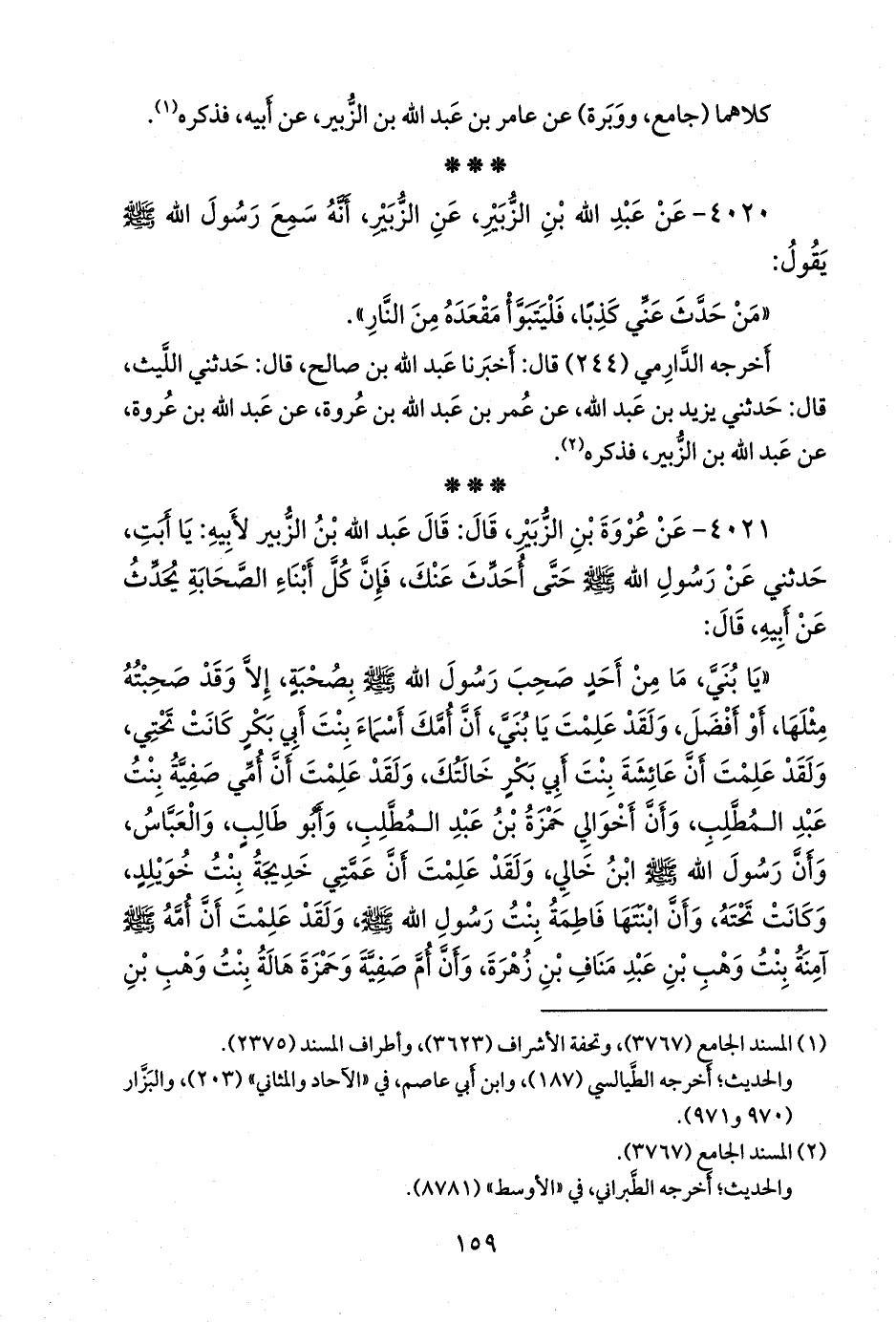 ٤٠٢١ - عن عروة بن الزبير، قال: قال عبد الله بن الزبير لأبيه: يا أبت، حدثني عن رسول الله صَلى الله عَليه وسَلم حتى أحدث عنك، فإن كل أبناء الصحابة يحدث عن أبيه، قال: