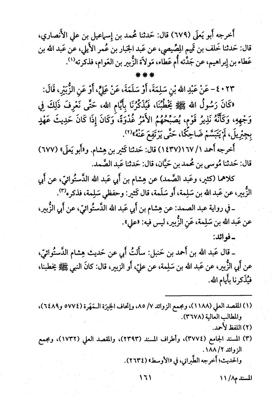 - قال عبد الله بن أحمد بن حنبل: سألت أبي عن حديث هشام الدَّستوائي، عن أبي الزبير، عن عبد الله بن سَلِمة، عن علي، أو الزبير، قال: كان النبي صَلى الله عَليه وسَلم يخطبنا، فيذكرنا بأيام الله.