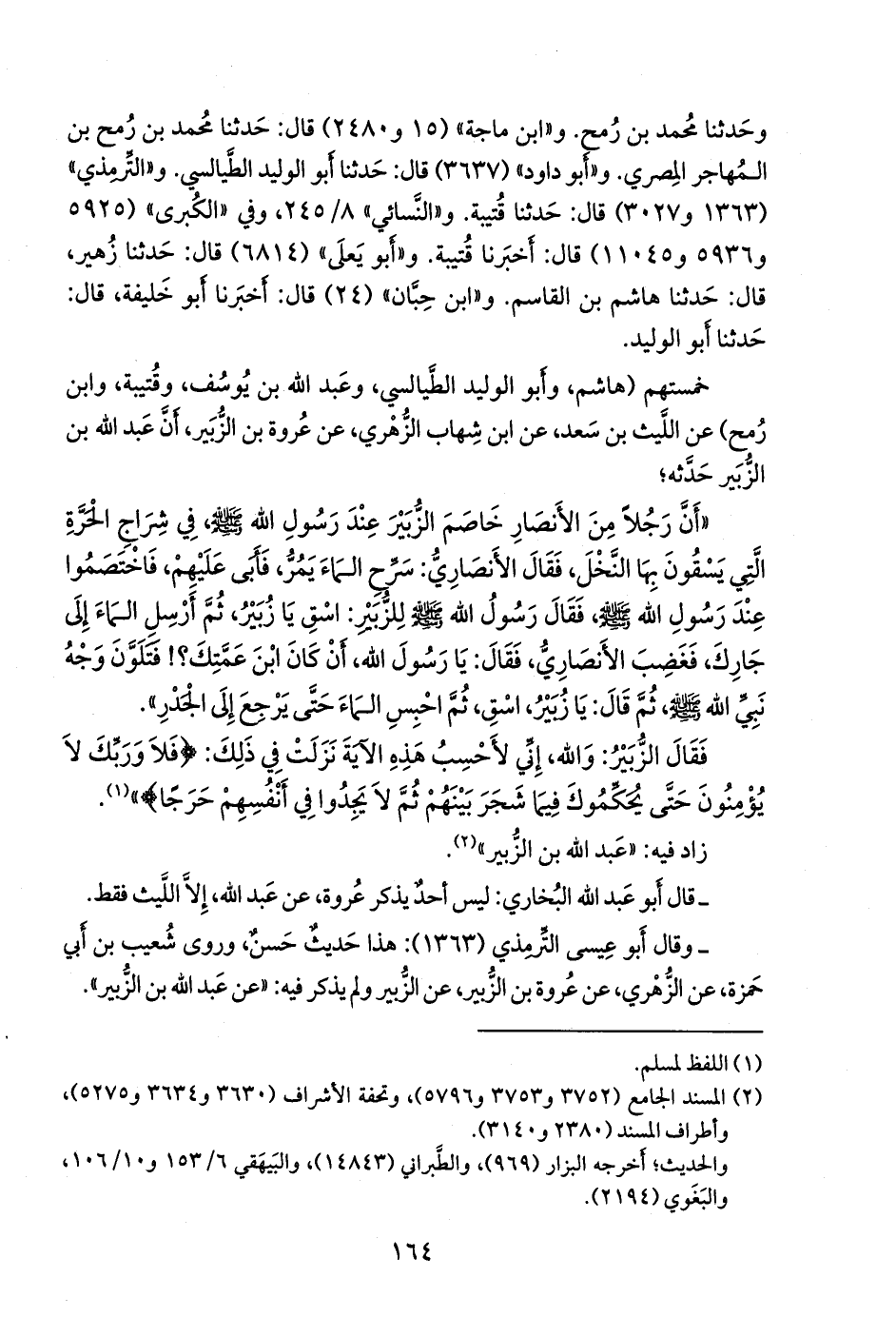«أن رجلا من الأنصار خاصم الزبير عند رسول الله صَلى الله عَليه وسَلم في شراج الحرة التي يسقون بها النخل، فقال الأَنصاري: سرح الماء يمر، فأبى عليهم، فاختصموا عند رسول الله صَلى الله عَليه وسَلم فقال رسول الله صَلى الله عَليه وسَلم للزبير: اسق يا زبير، ثم أرسل الماء إلى جارك، فغضب الأَنصاري، فقال: يا رسول الله، أن كان ابن عمتك؟! فتلون وجه نبي الله صَلى الله عَليه وسَلم ثم قال: يا زبير، اسق، ثم احبس الماء حتى يرجع إلى الجدر».