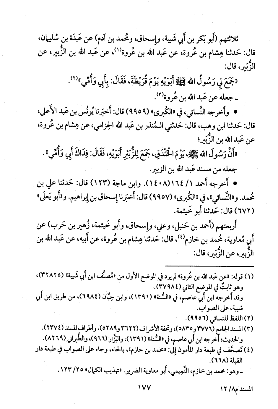أربعتهم (أحمد بن حنبل، وعلي، وإسحاق، وأَبو خيثمة زهير بن حرب) عن أبي معاوية محمد بن خازم (¬١)، قال: حدثنا هشام بن عروة، عن أبيه، عن عبد الله بن الزبير، عن الزبير، قال: