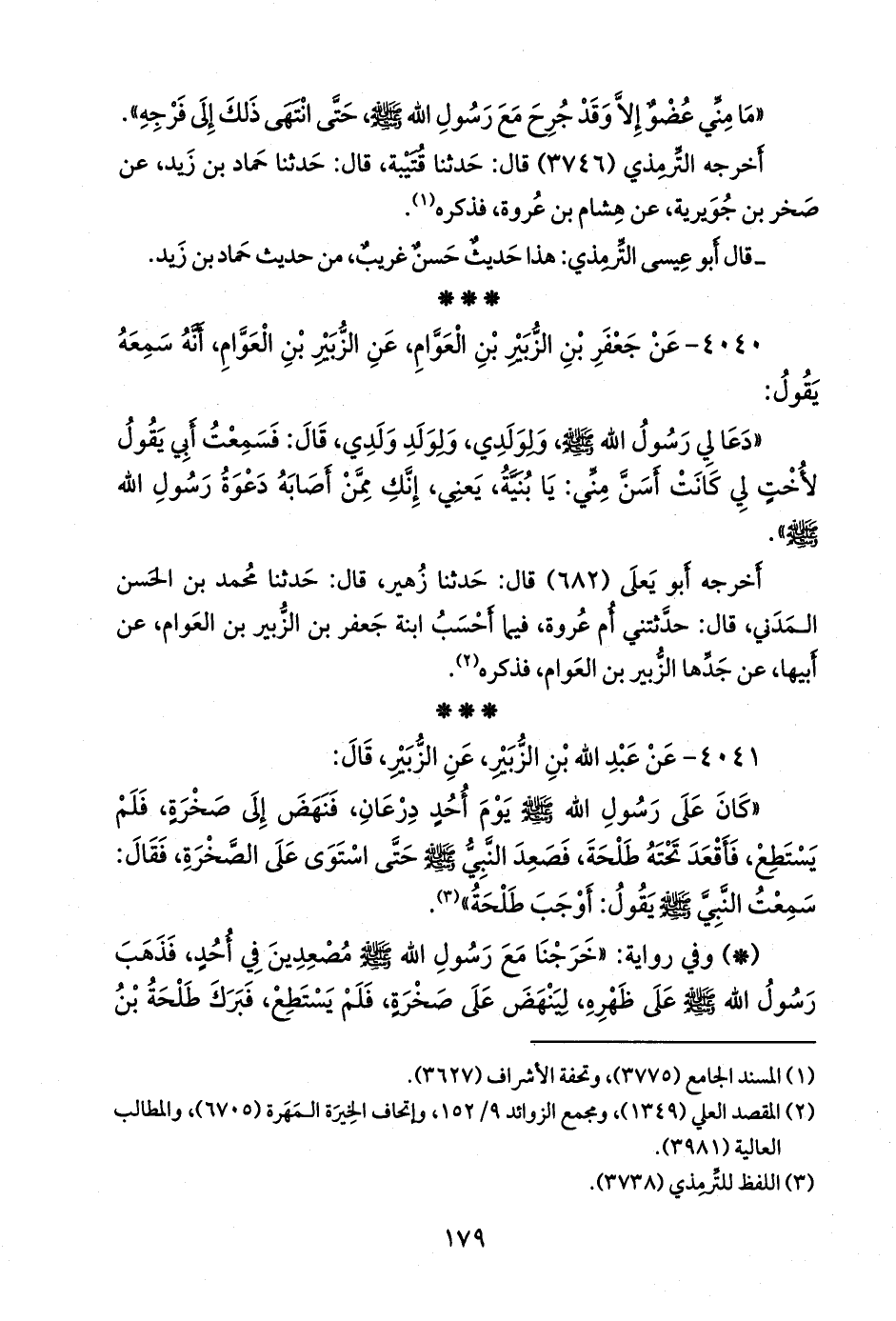 - وفي رواية: «سمعت رسول الله صَلى الله عَليه وسَلم يقول يومئذ: أوجب طلحة، حين صنع برسول الله ما صنع».
