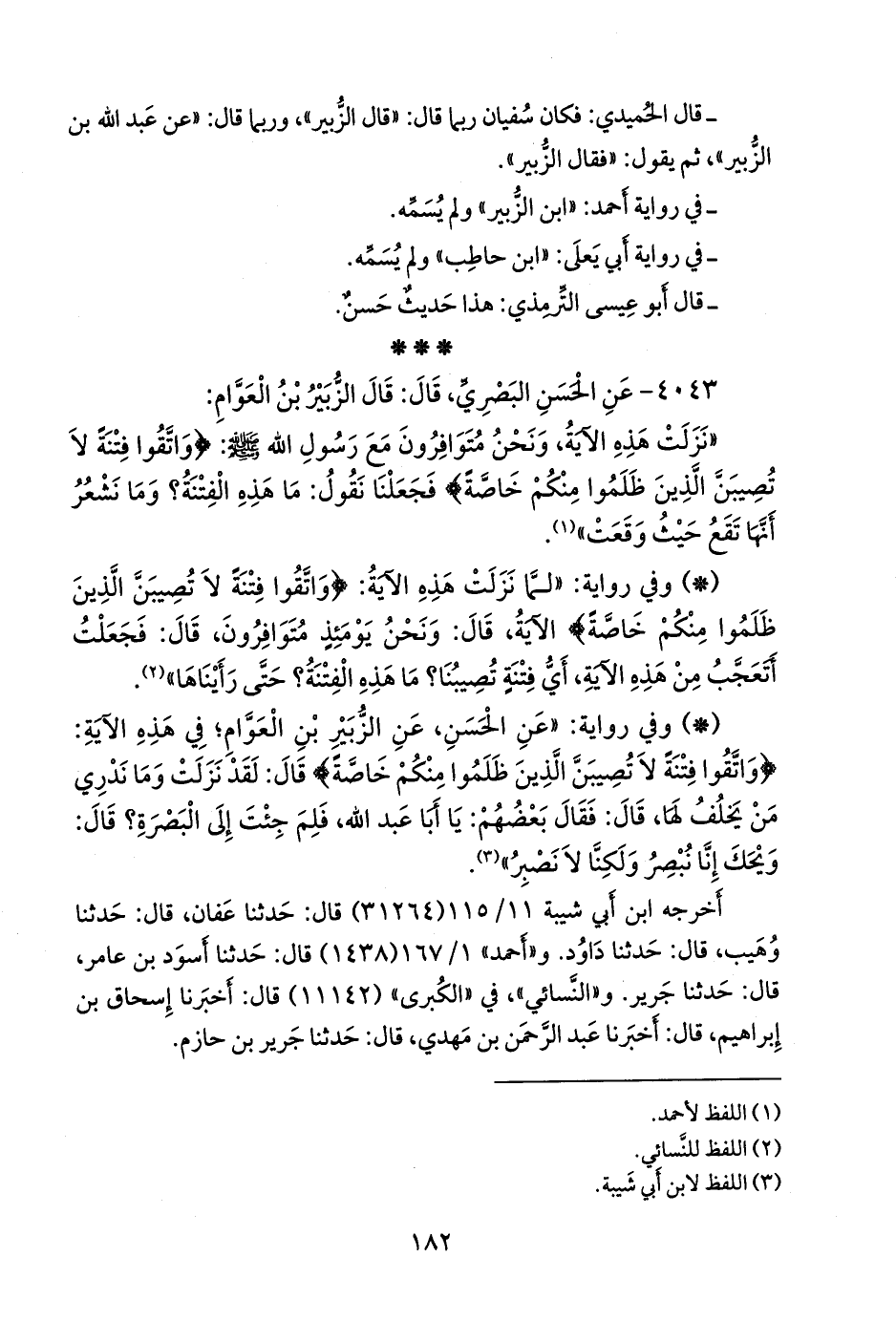- وفي رواية: «عن الحسن، عن الزبير بن العوام؛ في هذه الآية: {واتقوا فتنة لا تصيبن الذين ظلموا منكم خاصة} قال: لقد نزلت وما ندري من يخلف لها، قال: فقال بعضهم: يا أبا عبد الله، فلم جئت إلى البصرة؟ قال: ويحك إنا نبصر ولكنا لا نصبر» (¬٣).