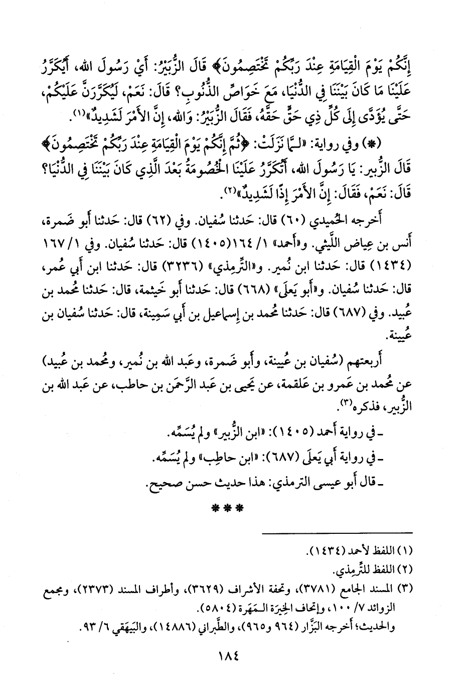 أربعتهم (سفيان بن عُيينة، وأَبو ضمرة، وعبد الله بن نُمير، ومحمد بن عبيد) عن محمد بن عَمرو بن علقمة، عن يحيى بن عبد الرَّحمَن بن حاطب، عن عبد الله بن الزبير، فذكره (¬١).