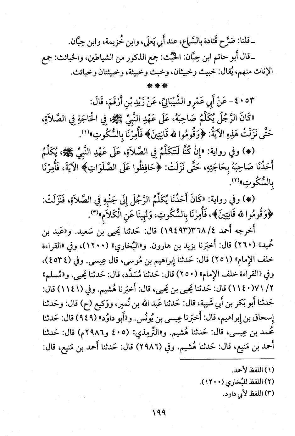 - وفي رواية: «كان أحدنا يكلم الرجل إلى جنبه في الصلاة، فنزلت: {وقوموا لله قانتين}، فأمرنا بالسكوت، ونهينا عن الكلام» (¬٣).