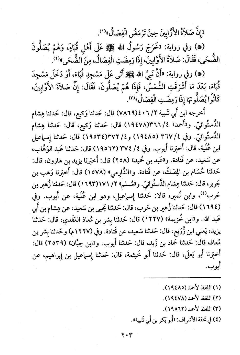 - أخرجه عبد الرزاق (٤٨٣٢) عن مَعمَر، عن أيوب، عن القاسم الشيباني، عن زيد بن أرقم؛ أنه رأى قوما يصلون بعد ما طلعت الشمس، فقال: لو أدرك هؤلاء السلف الأول، علموا أن غير هذه الصلاة خير منها، صلاة الأوابين إذا رَمِضَت الفصال. «موقوف».