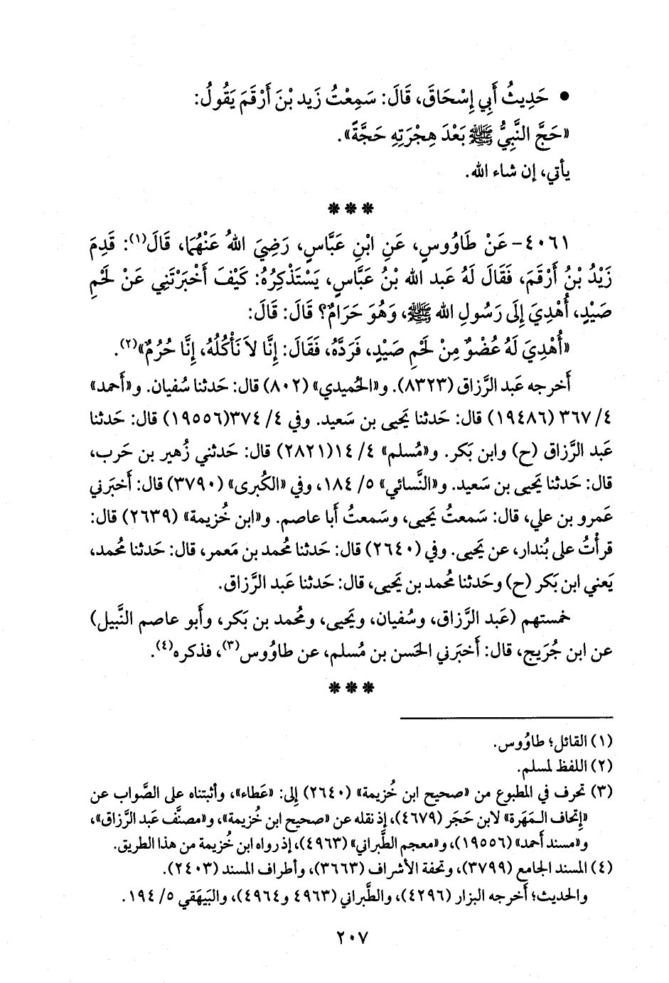 ٤٠٦١ - عن طاووس، عن ابن عباس، رضي الله عنهما، قال (¬١): قدم زيد بن أرقم، فقال له عبد الله بن عباس، يستذكره: كيف أخبرتني عن لحم صيد، أهدي إلى رسول الله صَلى الله عَليه وسَلم وهو حرام؟ قال: قال: