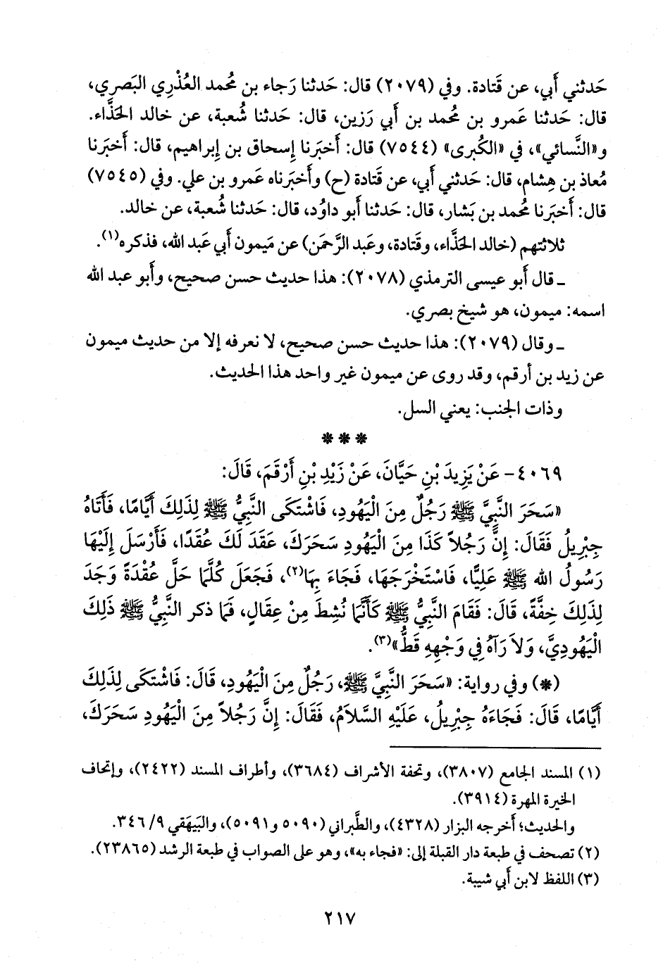 - وفي رواية: «سحر النبي صَلى الله عَليه وسَلم رجل من اليهود، قال: فاشتكى لذلك أياما، قال: فجاءه جبريل، عليه السلام، فقال: إن رجلا من اليهود سحرك،