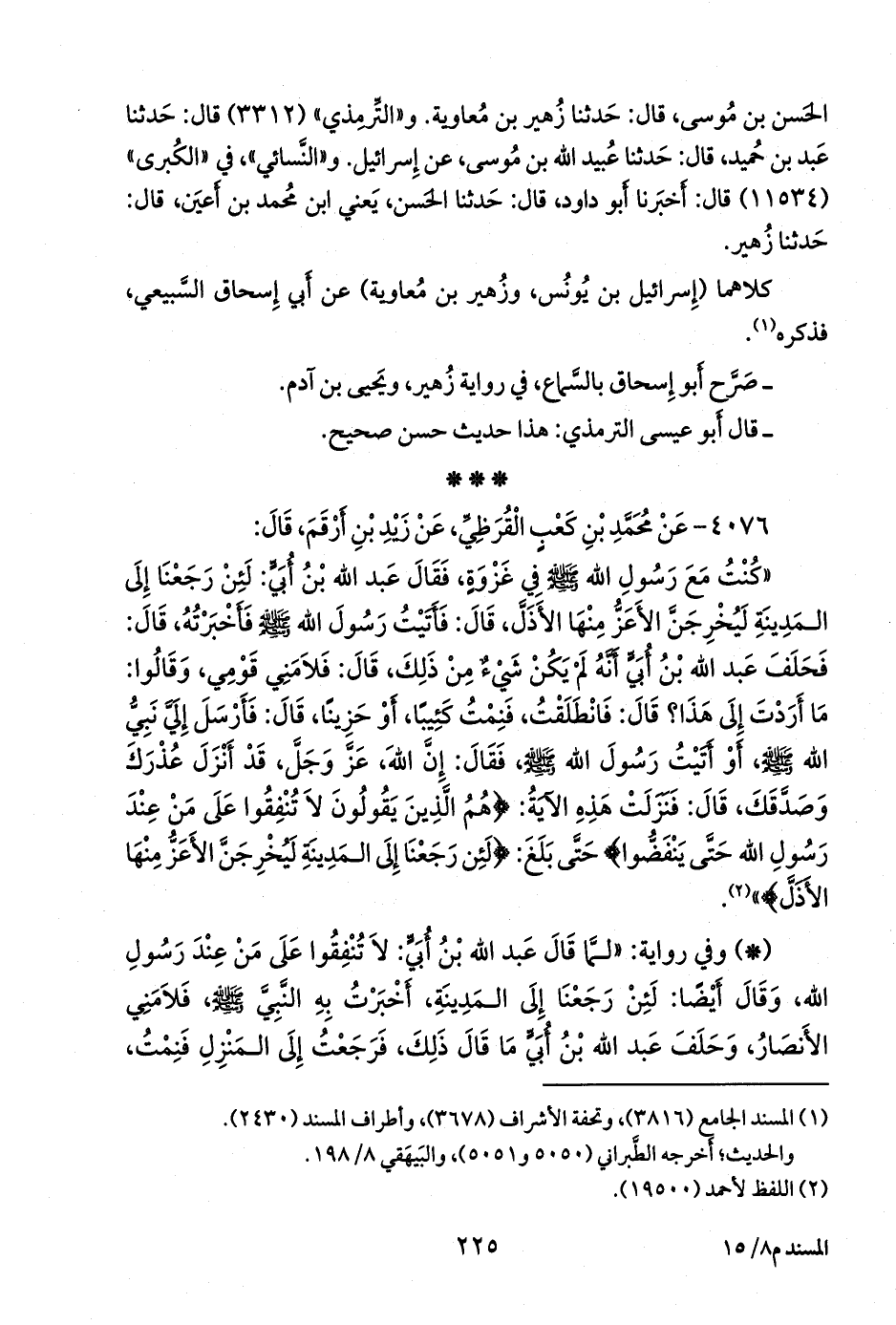 «كنت مع رسول الله صَلى الله عَليه وسَلم في غزوة، فقال عبد الله بن أبي: لئن رجعنا إلى المدينة ليخرجن الأعز منها الأذل، قال: فأتيت رسول الله صَلى الله عَليه وسَلم فأخبرته، قال: فحلف عبد الله بن أبي أنه لم يكن شيء من ذلك، قال: فلامني قومي، وقالوا: ما أردت إلى هذا؟ قال: فانطلقت، فنمت كئيبا، أو حزينا، قال: فأرسل إلي نبي الله صَلى الله عَليه وسَلم أو أتيت رسول الله صَلى الله عَليه وسَلم فقال: إن الله، عز وجل، قد أنزل عذرك وصدقك، قال: فنزلت هذه الآية: {هم الذين يقولون لا تنفقوا على من عند رسول الله حتى ينفضوا} حتى بلغ: {لئن رجعنا إلى المدينة ليخرجن الأعز منها الأذل}» (¬١).