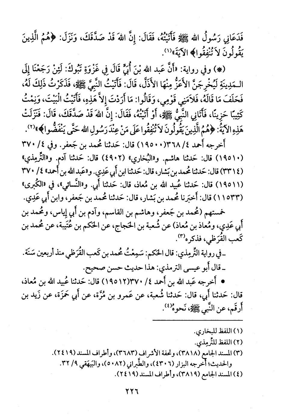 - وفي رواية: «أن عبد الله بن أبي قال في غزوة تبوك: لئن رجعنا إلى المدينة ليخرجن الأعز منها الأذل، قال: فأتيت النبي صَلى الله عَليه وسَلم فذكرت ذلك له، فحلف ما قاله، فلامني قومي، وقالوا: ما أردت إلا هذه، فأتيت البيت، ونمت كئيبا حزينا، فأتاني النبي صَلى الله عَليه وسَلم أو أتيته، فقال: إن الله قد صدقك، قال: فنزلت هذه الآية: {هم الذين يقولون لا تنفقوا على من عند رسول الله حتى ينفضوا}» (¬١).