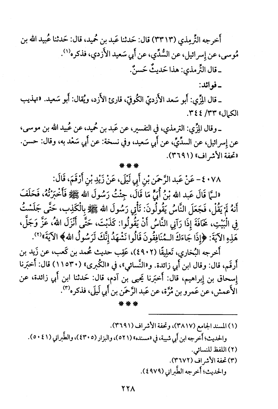 - وقال المِزِّي: التِّرمِذي، في التفسير، عن عَبد بن حُميد، عن عُبيد الله بن موسى، عن إسرائيل، عن السُّدِّي، عن أبي سعيد، وفي نسخة: عن أبي سعد به، وقال: حسن. «تحفة الأشراف» (٣٦٩١).