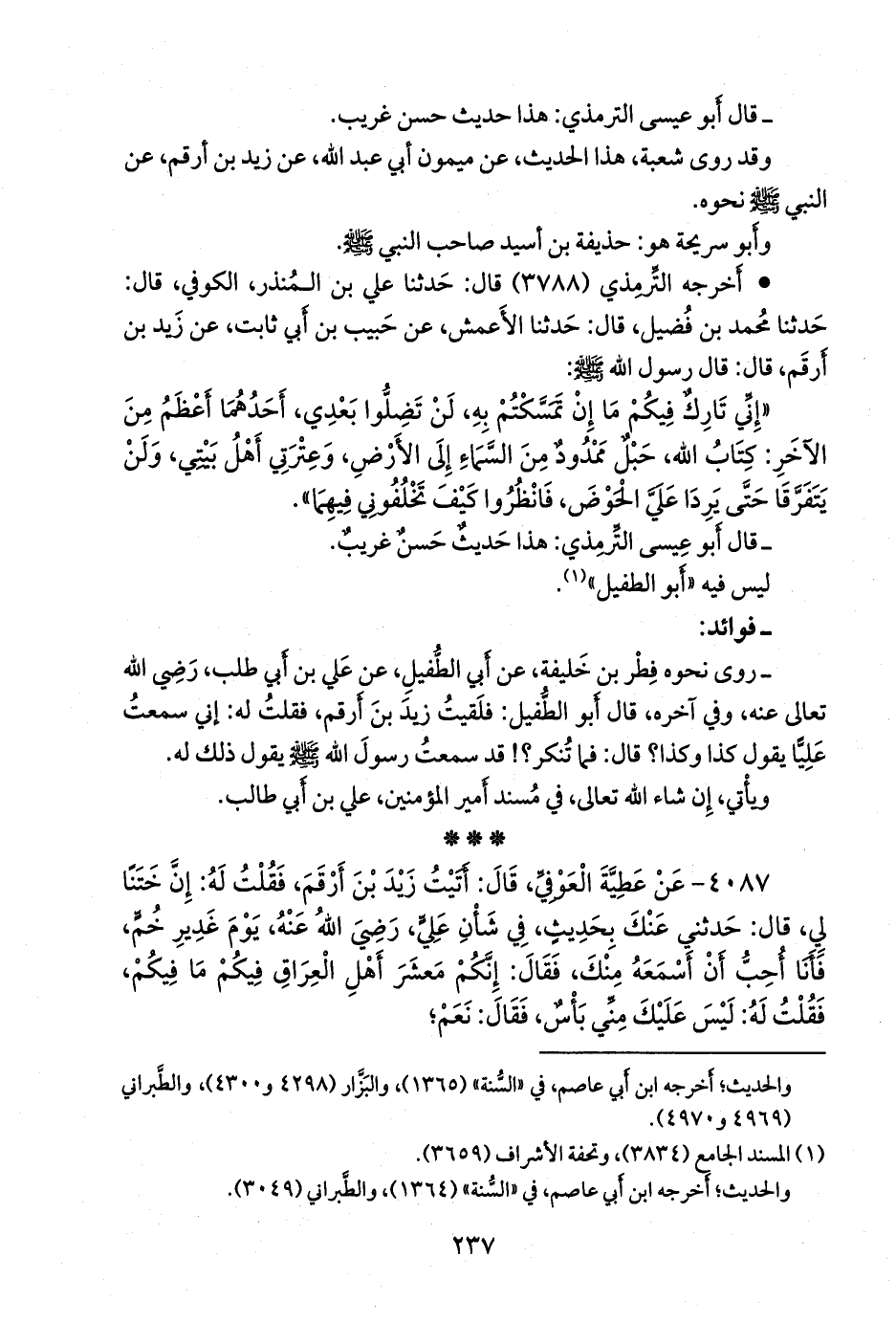 ٤٠٨٧ - عن عطية العوفي، قال: أتيت زيد بن أرقم، فقلت له: إن ختنا لي، قال: حدثني عنك بحديث، في شأن علي، رضي الله عنه، يوم غدير خم، فأنا أحب أن أسمعه منك، فقال: إنكم معشر أهل العراق فيكم ما فيكم، فقلت له: ليس عليك مني بأس، فقال: نعم؛