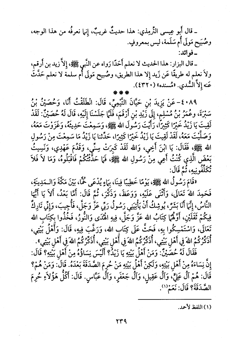 «قام رسول الله صَلى الله عَليه وسَلم يوما خطيبا فينا، بماء يدعى خما، بين مكة والمدينة، فحمد الله تعالى، وأثنى عليه، ووعظ، وذكر، ثم قال: أما بعد، ألا يا أيها الناس، إنما أنا بشر، يوشك أن يأتيني رسول ربي عز وجل، فأجيب، وإني تارك فيكم ثقلين، أولهما كتاب الله عز وجل، فيه الهدى والنور، فخذوا بكتاب الله تعالى، واستمسكوا به، فحث على كتاب الله، ورغب فيه، قال: وأهل بيتي، أذكركم الله في أهل بيتي، أذكركم الله في أهل بيتي، أذكركم الله في أهل بيتي».