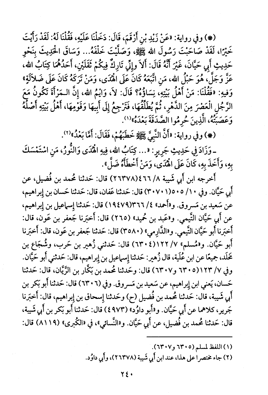 - وفي رواية: «عن يزيد بن حيان التيمي، عن زيد بن أرقم، قال (¬١): دخلنا عليه، فقلنا له: لقد رأيت خيرا، لقد صاحبت رسول الله صَلى الله عَليه وسَلم وصليت خلفه، وساق الحديث بنحو حديث أبي حيان، غير أنه قال: ألا وإني تارك فيكم ثقلين، أحدهما كتاب الله، عز وجل، هو حبل الله، من اتبعه كان على الهدى، ومن تركه كان على ضلالة» وفيه: «فقلنا: من أهل بيته، نساؤه؟ قال: لا، وايم الله، إن المرأة تكون مع الرجل العصر من الدهر، ثم يطلقها، فترجع إلى أبيها وقومها، أهل بيته أصله وعصبته، الذين حرموا الصدقة بعده» (¬٢).