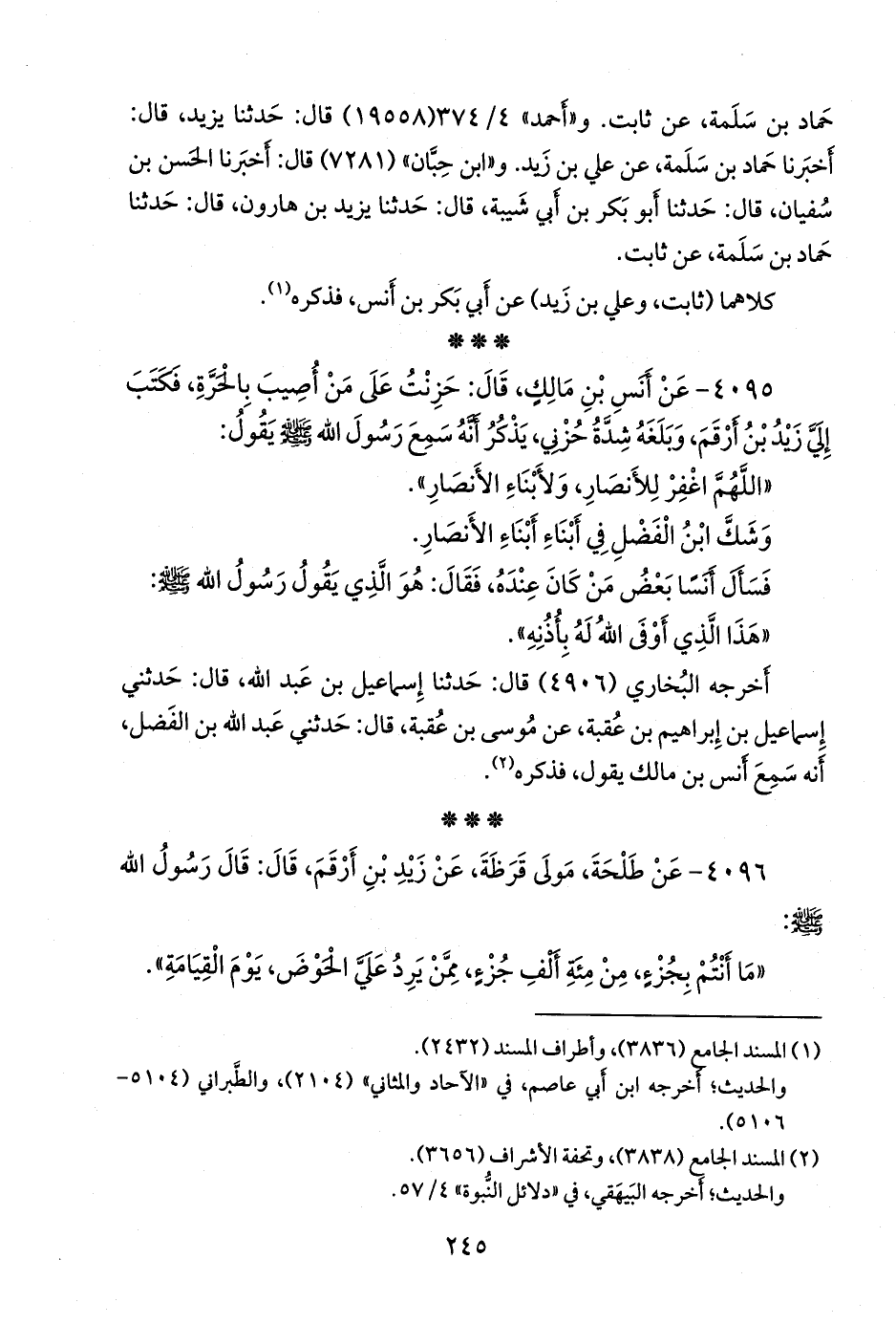 ٤٠٩٥ - عن أَنس بن مالك، قال: حزنت على من أصيب بالحرة، فكتب إلي زيد بن أرقم، وبلغه شدة حزني، يذكر أنه سمع رسول الله صَلى الله عَليه وسَلم يقول: