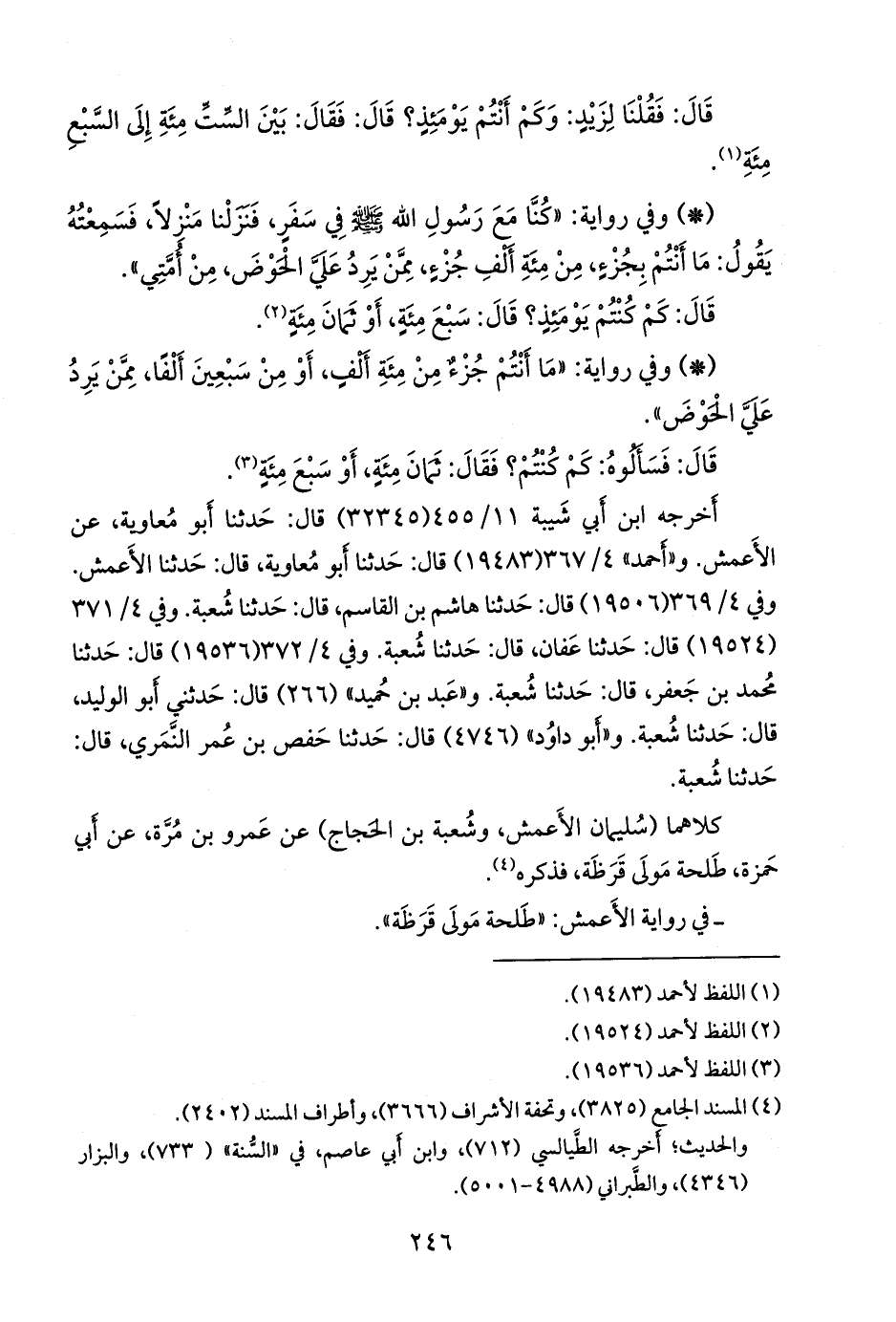 وفي ٤/ ٣٦٩ (١٩٥٠٦) قال: حدثنا هاشم بن القاسم، قال: حدثنا شعبة. وفي ٤/ ٣٧١ (١٩٥٢٤) قال: حدثنا عفان، قال: حدثنا شعبة. وفي ٤/ ٣٧٢ (١٩٥٣٦) قال: حدثنا محمد بن جعفر، قال: حدثنا شعبة. و «عَبد بن حُميد» (٢٦٦) قال: حدثني أَبو الوليد، قال: حدثنا شعبة. و «أَبو داود» (٤٧٤٦) قال: حدثنا حفص بن عمر النمري، قال: حدثنا شعبة.