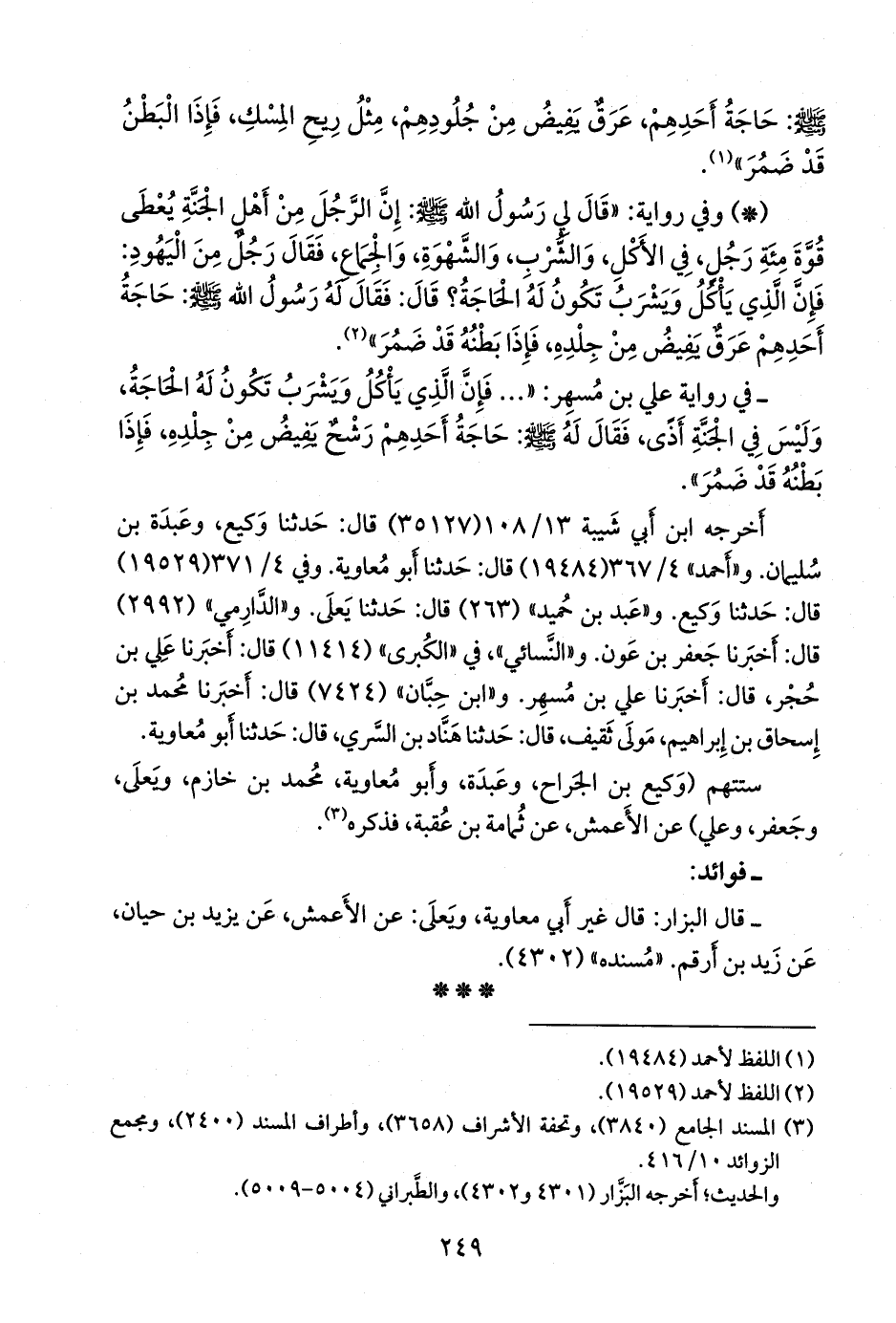 ـ في رواية علي بن مُسهِر: «فإن الذي يأكل ويشرب تكون له الحاجة، وليس في الجنة أذى، فقال له صَلى الله عَليه وسَلم: حاجة أحدهم رشح يفيض من جلده، فإذا بطنه قد ضمر».