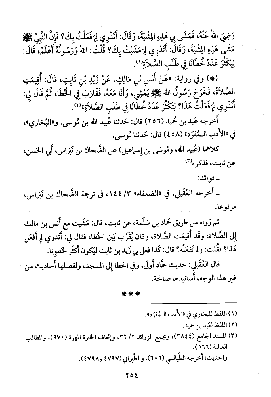 ثم رواه من طريق حماد بن سلمة، عن ثابت، قال: مشيت مع أَنس بن مالك إلى الصلاة، وقد أقيمت الصلاة، وكان يقرب بين الخطا، فقال لي: أتدري لم أفعل هذا؟ فقلت: ولم تفعله؟ قال: كذا فعل بي زيد بن ثابت ليكون أكثر لخطونا.