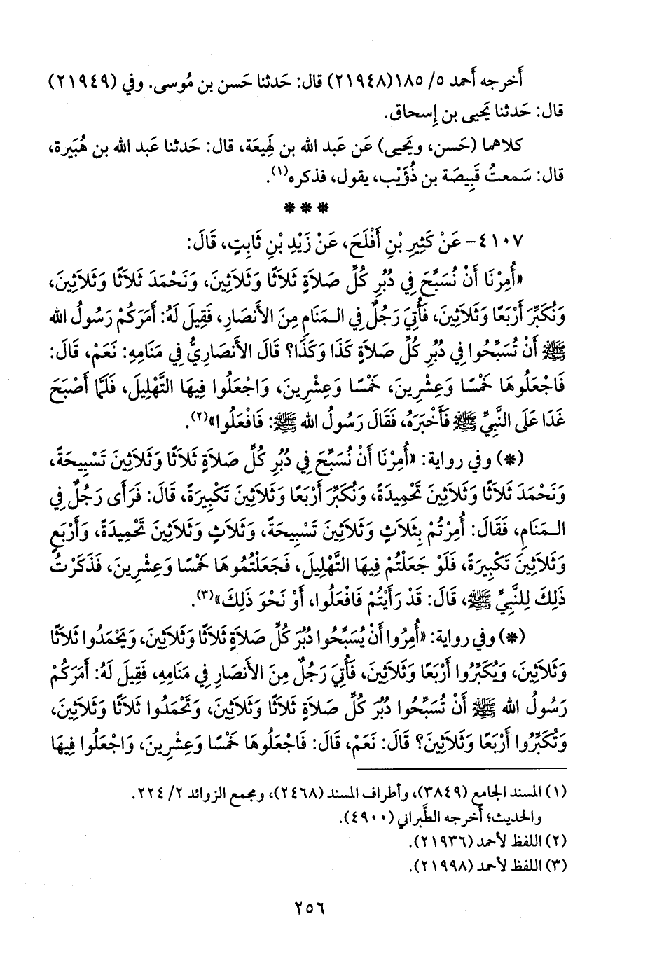 - وفي رواية: «أمروا أن يسبحوا دبر كل صلاة ثلاثا وثلاثين، ويحمدوا ثلاثا وثلاثين، ويكبروا أربعا وثلاثين، فأتي رجل من الأنصار في منامه، فقيل له: أمركم رسول الله صَلى الله عَليه وسَلم أن تسبحوا دبر كل صلاة ثلاثا وثلاثين، وتحمدوا ثلاثا وثلاثين، وتكبروا أربعا وثلاثين؟ قال: نعم، قال: فاجعلوها خمسا وعشرين، واجعلوا فيها