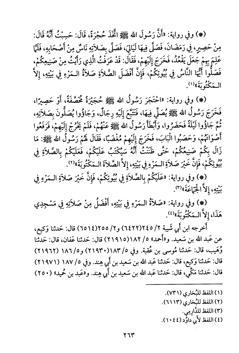- وفي رواية: «صلاة المرء في بيته، أفضل من صلاته في مسجدي هذا، إلا المكتوبة» (¬٢).