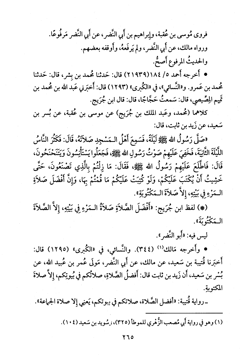 - رواية قتيبة: «أفضل الصلاة، صلاتكم في بيوتكم، يعني إلا صلاة الجماعة».