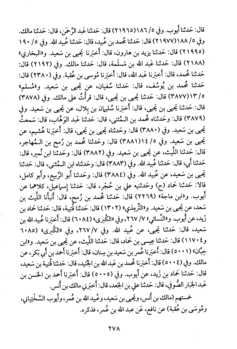 وفي (٣٨٧٨) قال: حدثنا يحيى بن يحيى، قال: أخبرنا سليمان بن بلال، عن يحيى بن سعيد. وفي (٣٨٧٩) قال: وحدثناه محمد بن المثنى، قال: حدثنا عبد الوَهَّاب، قال: سمعت يحيى بن سعيد. وفي (٣٨٨٠) قال: وحدثناه يحيى بن يحيى، قال: أخبرنا هُشيم، عن يحيى بن سعيد. وفي ٥/ ١٤ (٣٨٨١) قال: وحدثنا محمد بن رُمح بن المهاجر، قال: حدثنا الليث، عن يحيى بن سعيد. وفي (٣٨٨٢) قال: وحدثنا ابن نُمير، قال: حدثنا أبي، قال: حدثنا عُبيد الله. وفي (٣٨٨٣) قال: وحدثناه ابن المثنى، قال: حدثنا يحيى بن سعيد، عن عُبيد الله. وفي (٣٨٨٤) قال: وحدثنا أَبو الربيع، وأَبو كامل، قالا: حدثنا حماد (ح) وحدثنيه علي بن حُجْر، قال: حدثنا إسماعيل، كلاهما عن أيوب. و «ابن ماجة» (٢٢٦٩) قال: حدثنا محمد بن رُمح، قال: أنبأنا الليث بن سعد، عن يحيى بن سعيد. و «التِّرمِذي» (١٣٠٢) قال: حدثنا قتيبة، قال: حدثنا حماد بن زيد، عن أيوب. و «النَّسَائي» ٧/ ٢٦٧، وفي «الكبرى» (٦٠٨٤) قال: أخبرنا عُبيد الله بن سعيد، قال: حدثنا يحيى، عن عُبيد الله. وفي ٧/ ٢٦٧، وفي «الكبرى» (٦٠٨٥ و ١١٧٠٤) قال: حدثنا عيسى بن حماد، قال: حدثنا الليث، عن يحيى بن سعيد. و «ابن حِبَّان» (٥٠٠١) قال: أخبرنا عمر بن سعيد بن سنان، قال: أخبرنا أحمد بن أَبي بكر، عن مالك. وفي (٥٠٠٤) قال: أخبرنا محمد بن عبد الله بن الجنيد، قال: حدثنا قتيبة بن سعيد، قال: حدثنا حماد بن زيد، عن أيوب. وفي (٥٠٠٥) قال: أخبرنا أحمد بن الحسن بن عبد الجبار الصوفي، قال: حدثنا علي بن الجعد، قال: أخبرني مالك بن أنس.