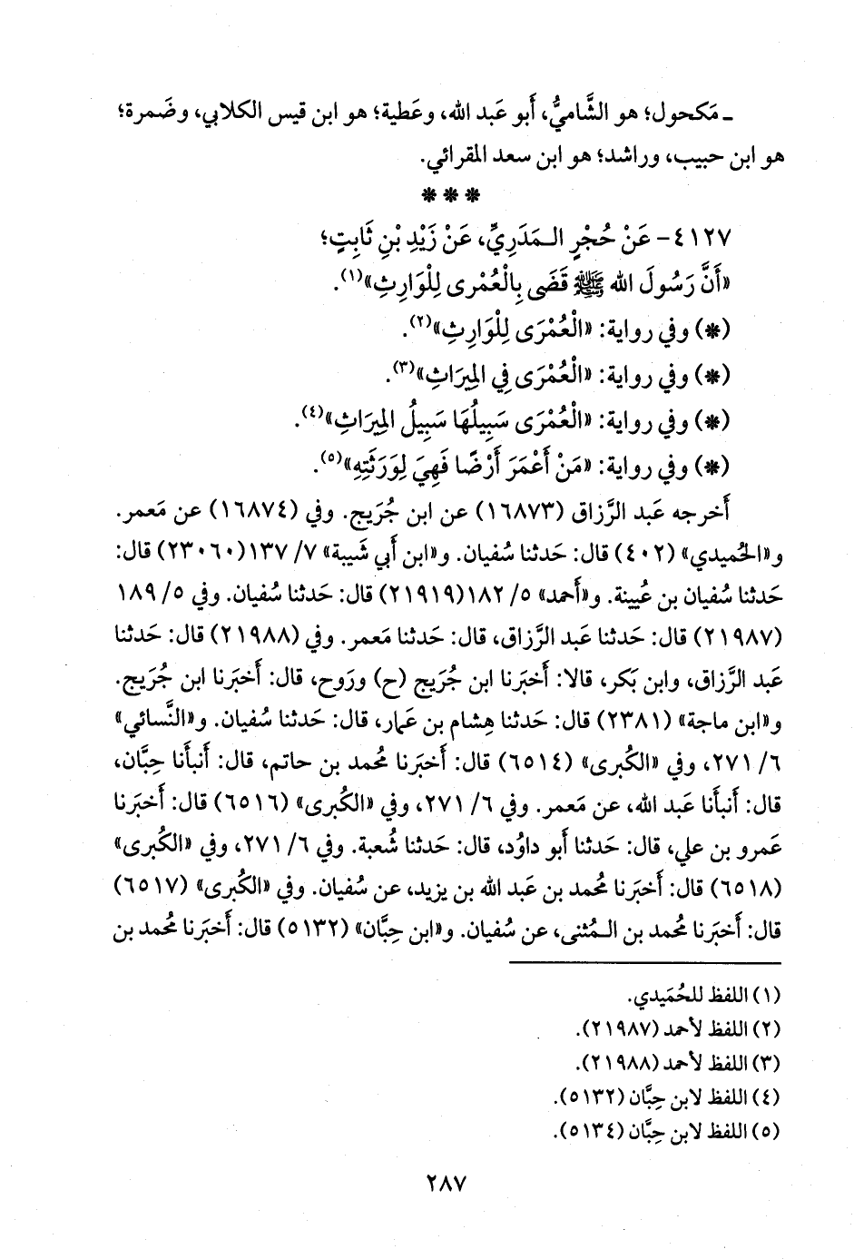 - وفي رواية: «العُمرَى سبيلها سبيل الميراث» (¬٤).