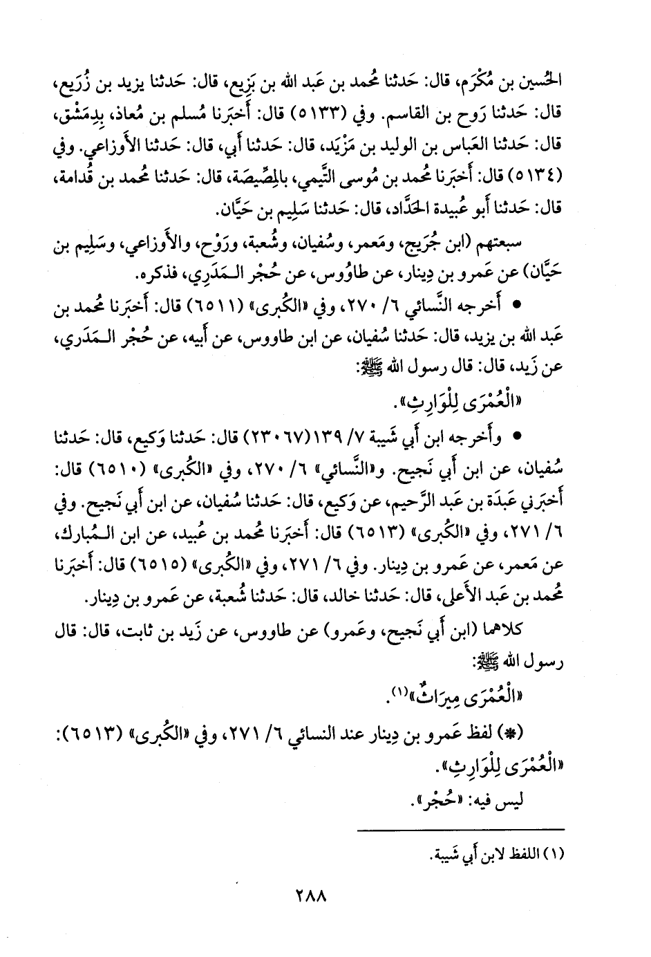 - لفظ عَمرو بن دينار عند النَّسَائي ٦/ ٢٧١، وفي «الكبرى» (٦٥١٣): «العُمرَى للوارث».