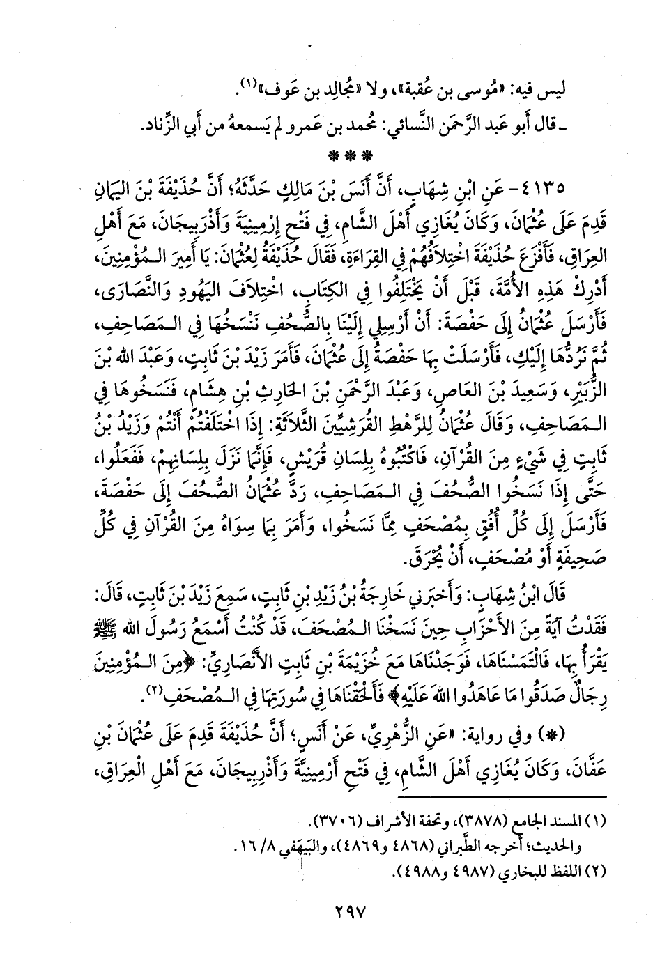 ٤١٣٥ - عن ابن شهاب، أن أَنس بن مالك حدثه؛ أن حذيفة بن اليمان قدم على عثمان، وكان يغازي أهل الشام، في فتح إرمينية وأذربيجان، مع أهل العراق، فأفزع حذيفة اختلافهم في القراءة، فقال حذيفة لعثمان: يا أمير المؤمنين، أدرك هذه الأمة، قبل أن يختلفوا في الكتاب، اختلاف اليهود والنصارى، فأرسل عثمان إلى حفصة: أن أرسلي إلينا بالصحف ننسخها في المصاحف، ثم نردها إليك، فأرسلت بها حفصة إلى عثمان، فأمر زيد بن ثابت، وعبد الله بن الزبير، وسعيد بن العاص، وعبد الرَّحمَن بن الحارث بن هشام، فنسخوها في المصاحف، وقال عثمان للرهط القرشيين الثلاثة: إذا اختلفتم أنتم وزيد بن ثابت في شيء من القرآن، فاكتبوه بلسان قريش، فإنما نزل بلسانهم، ففعلوا، حتى إذا نسخوا الصحف في المصاحف، رد عثمان الصحف إلى حفصة، فأرسل إلى كل أفق بمصحف مما نسخوا، وأمر بما سواه من القرآن في كل صحيفة أو مصحف، أن يحرق.