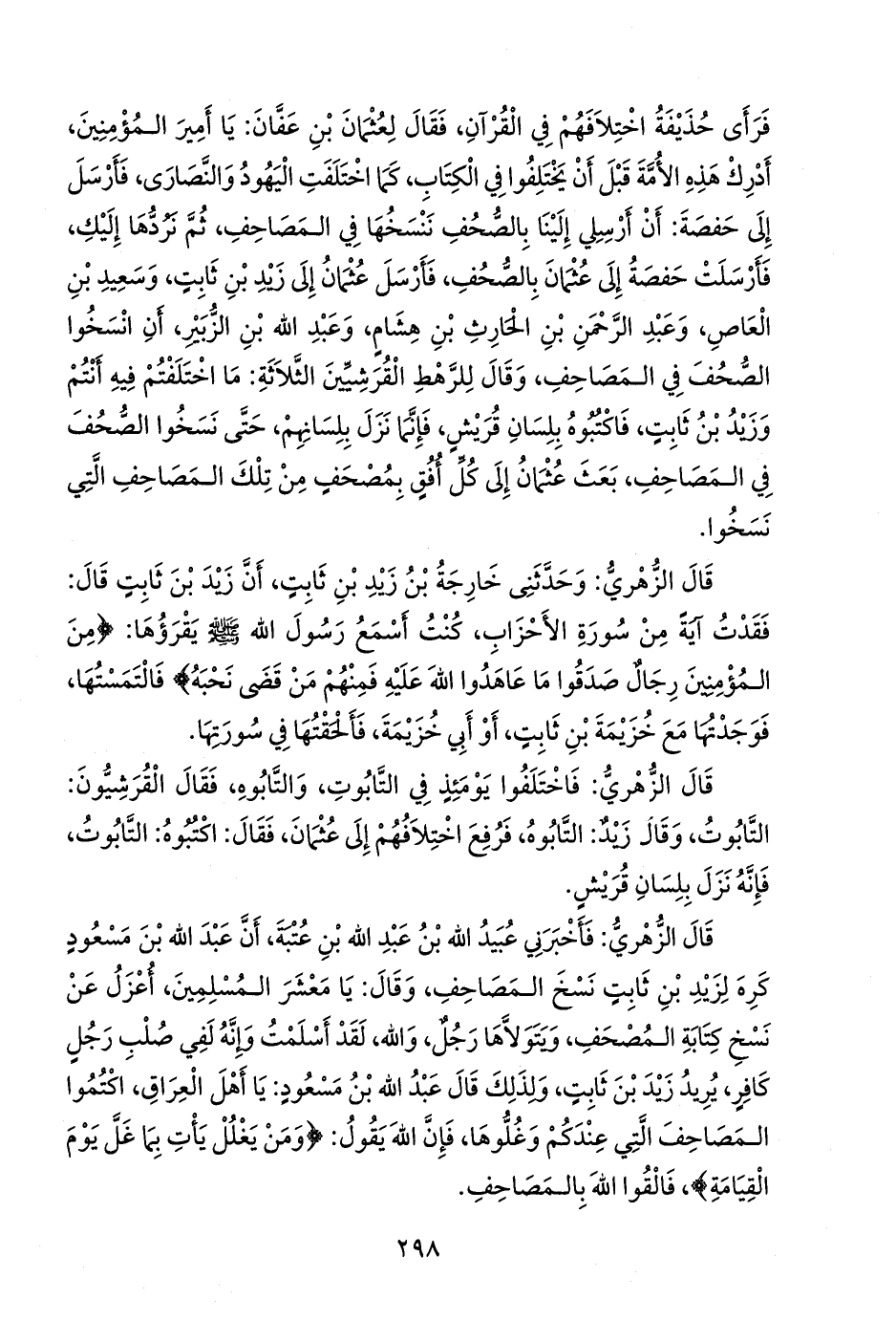 فرأى حذيفة اختلافهم في القرآن، فقال لعثمان بن عفان: يا أمير المؤمنين، أدرك هذه الأمة قبل أن يختلفوا في الكتاب، كما اختلفت اليهود والنصارى، فأرسل إلى حفصة: أن أرسلي إلينا بالصحف ننسخها في المصاحف، ثم نردها إليك، فأرسلت حفصة إلى عثمان بالصحف، فأرسل عثمان إلى زيد بن ثابت، وسعيد بن العاص، وعبد الرَّحمَن بن الحارث بن هشام، وعبد الله بن الزبير، أن انسخوا الصحف في المصاحف، وقال للرهط القرشيين الثلاثة: ما اختلفتم فيه أنتم وزيد بن ثابت، فاكتبوه بلسان قريش، فإنما نزل بلسانهم، حتى نسخوا الصحف في المصاحف، بعث عثمان إلى كل أفق بمصحف من تلك المصاحف التي نسخوا.