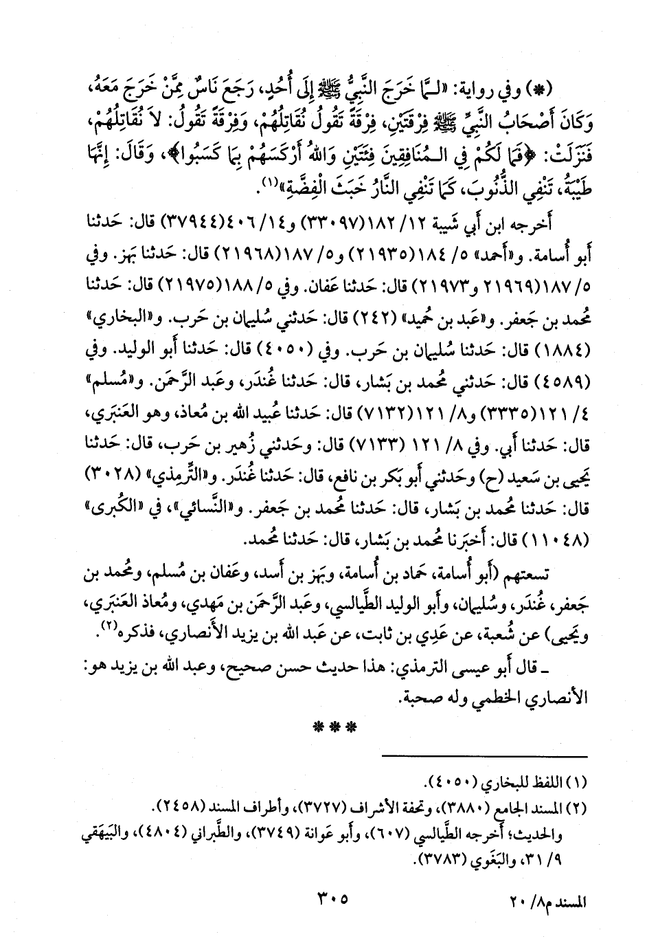 أخرجه ابن أبي شيبة (٣٣٠٩٧) و ١٤/ ٤٠٦ (٣٧٩٤٤) قال: حدثنا أَبو أُسامة. و «أحمد» ٥/ ١٨٤ (٢١٩٣٥) و ٥/ ١٨٧ (٢١٩٦٨) قال: حدثنا بَهز. وفي ٥/ ١٨٧ (٢١٩٦٩ و ٢١٩٧٣) قال: حدثنا عفان. وفي (٢١٩٧٥) قال: حدثنا محمد بن جعفر. و «عَبد بن حُميد» (٢٤٢) قال: حدثني سليمان بن حرب. و «البخاري» (١٨٨٤) قال: حدثنا سليمان بن حرب. وفي (٤٠٥٠) قال: حدثنا أَبو الوليد. وفي (٤٥٨٩) قال: حدثني محمد بن بشار، قال: حدثنا غُندَر، وعبد الرَّحمَن. و «مسلم» ٤/ ١٢١ (٣٣٣٥) و ٨/ ١٢١ (٧١٣٢) قال: حدثنا عُبيد الله بن معاذ، وهو العنبري، قال: حدثنا أبي. وفي ٨/ ١٢١ (٧١٣٣) قال: وحدثني زهير بن حرب، قال: حدثنا يحيى بن سعيد (ح) وحدثني أَبو بكر بن نافع، قال: حدثنا غُندَر. و «التِّرمِذي» (٣٠٢٨) قال: حدثنا محمد بن بشار، قال: حدثنا محمد بن جعفر. و «النَّسَائي» في «الكبرى» (١١٠٤٨) قال: أخبرنا محمد بن بشار، قال: حدثنا محمد.