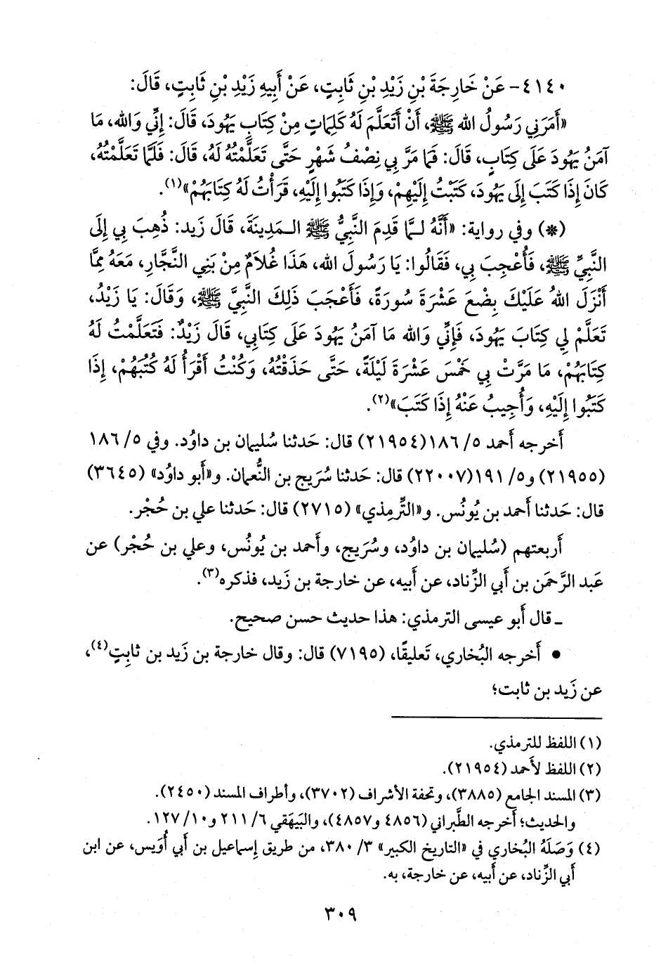 «أن النبي صَلى الله عَليه وسَلم أمره أن يتعلم كتاب اليهود، حتى كتبت للنبي صَلى الله عَليه وسَلم كتبه، وأقرأته كتبهم، إذا كتبوا إليه».