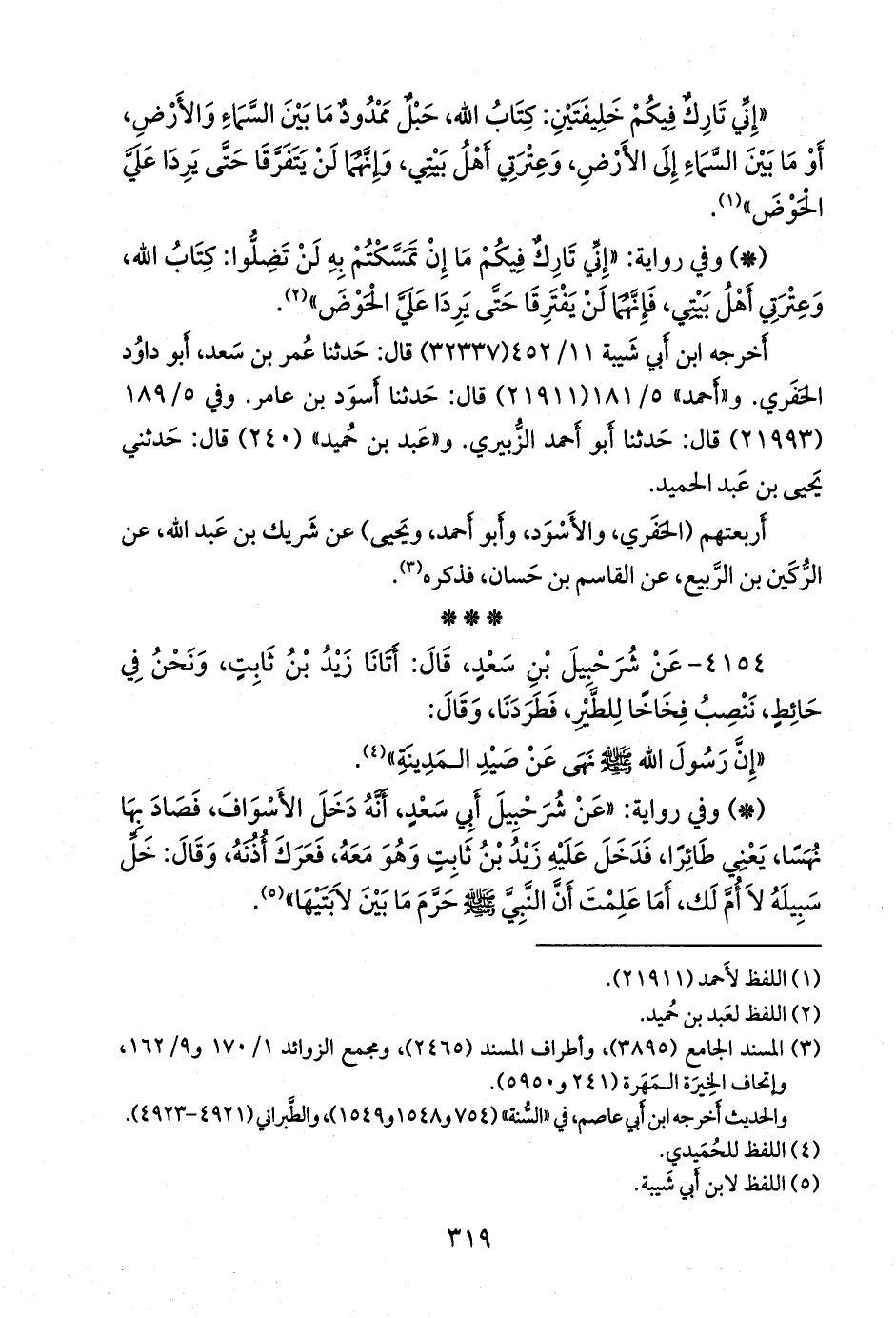 ٤١٥٤ - عن شرحبيل بن سعد، قال: أتانا زيد بن ثابت، ونحن في حائط، ننصب فخاخا للطير، فطردنا، وقال: