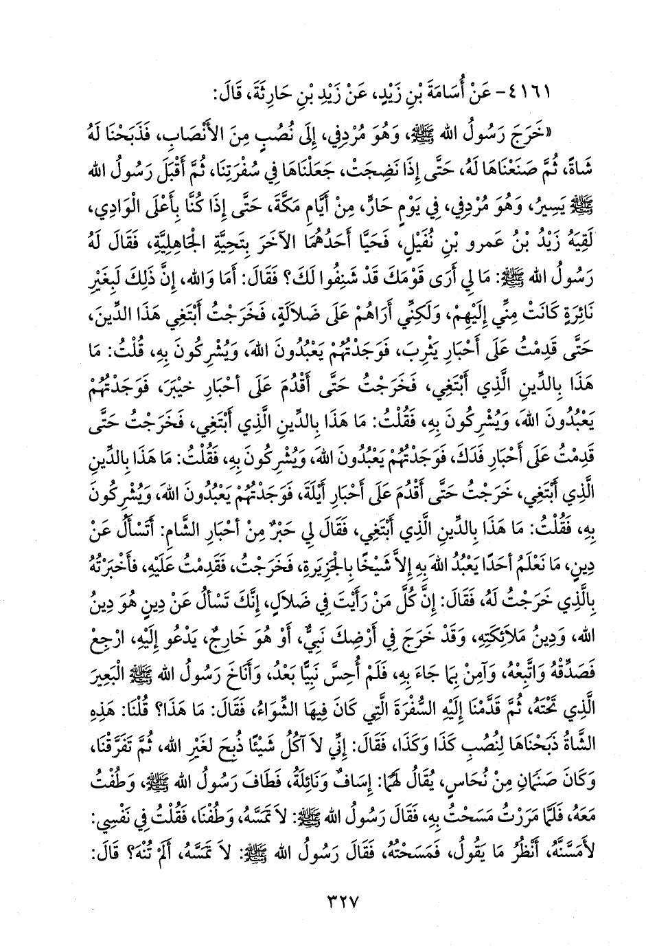 «خرج رسول الله صَلى الله عَليه وسَلم وهو مردفي، إلى نصب من الأنصاب، فذبحنا له شاة، ثم صنعناها له، حتى إذا نضجت، جعلناها في سفرتنا، ثم أقبل رسول الله صَلى الله عَليه وسَلم يسير، وهو مردفي، في يوم حار، من أيام مكة، حتى إذا كنا بأعلى الوادي، لقيه زيد بن عَمرو بن نفيل، فحيا أحدهما الآخر بتحية الجاهلية، فقال له رسول الله صَلى الله عَليه وسَلم: ما لي أرى قومك قد شنفوا لك؟ فقال: أما والله، إن ذلك لبغير نائرة كانت مني إليهم، ولكني أراهم على ضلالة، فخرجت أبتغي هذا الدين، حتى قدمت على أحبار يثرب، فوجدتهم يعبدون الله، ويشركون به، قلت: ما هذا بالدين الذي أبتغي، فخرجت حتى أقدم على أحبار خيبر، فوجدتهم يعبدون الله، ويشركون به، فقلت: ما هذا بالدين الذي أبتغي، فخرجت حتى قدمت على أحبار فدك، فوجدتهم يعبدون الله، ويشركون به، فقلت: ما هذا بالدين الذي أبتغي، خرجت حتى أقدم على أحبار أيلة، فوجدتهم يعبدون الله، ويشركون به، فقلت: ما هذا بالدين الذي أبتغي، فقال لي حبر من أحبار الشام: أتسأل عن دين، ما نعلم أحدا يعبد الله به إلا شيخا بالجزيرة، فخرجت، فقدمت عليه، فأخبرته بالذي خرجت له، فقال: إن كل من رأيت في ضلال، إنك تسأل عن دين هو دين الله، ودين ملائكته، وقد خرج في أرضك نبي، أو هو خارج، يدعو إليه، ارجع فصدقه واتبعه، وآمن بما جاء به، فلم أحس نبيا بعد، وأناخ رسول الله صَلى الله عَليه وسَلم البعير الذي تحته، ثم قدمنا إليه السفرة التي كان فيها الشواء، فقال: ما هذا؟ قلنا: هذه الشاة ذبحناها لنصب كذا وكذا،