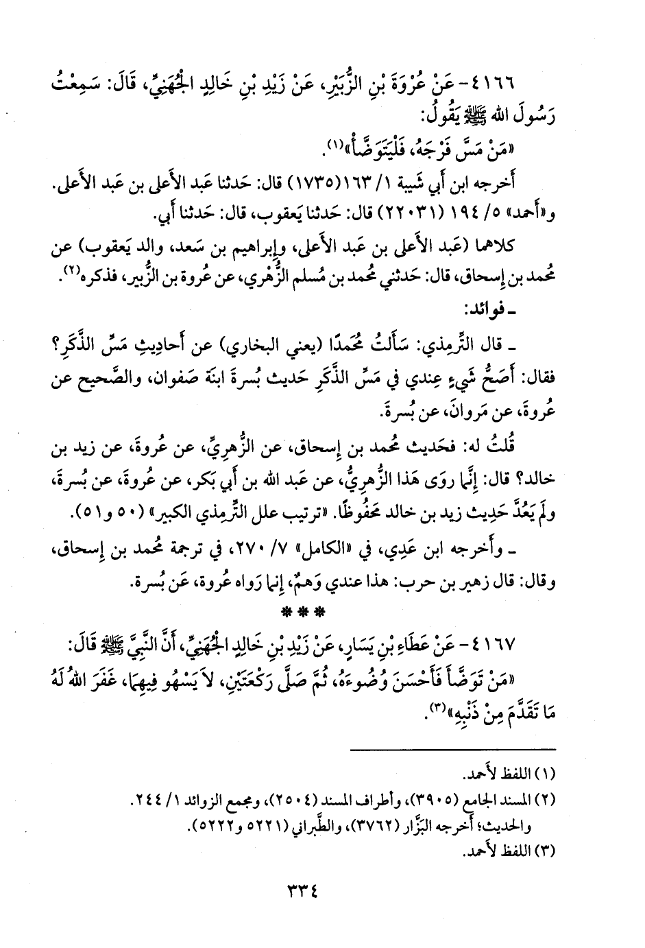 قلت له: فحديث محمد بن إسحاق، عن الزُّهْري، عن عروة، عن زيد بن خالد؟ قال: إنما روى هذا الزُّهْري، عن عبد الله بن أَبي بكر، عن عروة، عن بسرة، ولم يعد حديث زيد بن خالد محفوظا. «ترتيب علل التِّرمِذي الكبير» (٥٠ و ٥١).