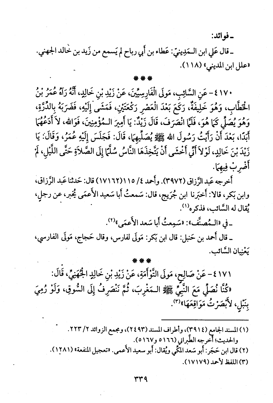 ٤١٧٠ - عن السائب مولى الفارسيين، عن زيد بن خالد، أنه رآه عمر بن الخطاب، وهو خليفة، ركع بعد العصر ركعتين، فمشى إليه، فضربه بالدرة، وهو يصلي كما هو، فلما انصرف، قال زيد: يا أمير المؤمنين، فوالله، لا أدعهما أبدا، بعد أن رأيت رسول الله صَلى الله عَليه وسَلم يصليهما، قال: فجلس إليه عمر، وقال: يا زيد بن خالد، لولا أني أخشى أن يتخذها الناس سلما إلى الصلاة حتى الليل، لم أضرب فيهما.