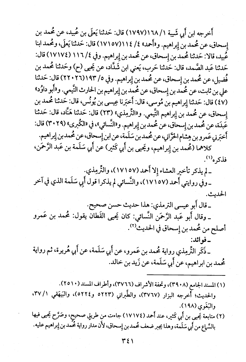 وفي ٥/ ١٩٣ (٢٢٠٢٦) قال: حدثنا علي بن ثابت، عن محمد بن إسحاق، عن محمد بن إبراهيم بن الحارث التيمي. و «أَبو داود» (٤٧) قال: حدثنا إبراهيم بن موسى، قال: أخبرنا عيسى بن يونس، قال: حدثنا محمد بن إسحاق، عن محمد بن إبراهيم التيمي. و «التِّرمِذي» (٢٣) قال: حدثنا هَنَّاد، قال: حدثنا عبدة، عن محمد بن إسحاق، عن محمد بن إبراهيم. و «النَّسَائي» في «الكبرى» (٣٠٢٩) قال: أخبرني عَمرو بن هشام الحراني، عن محمد بن سلمة، عن ابن إسحاق، عن محمد بن إبراهيم.