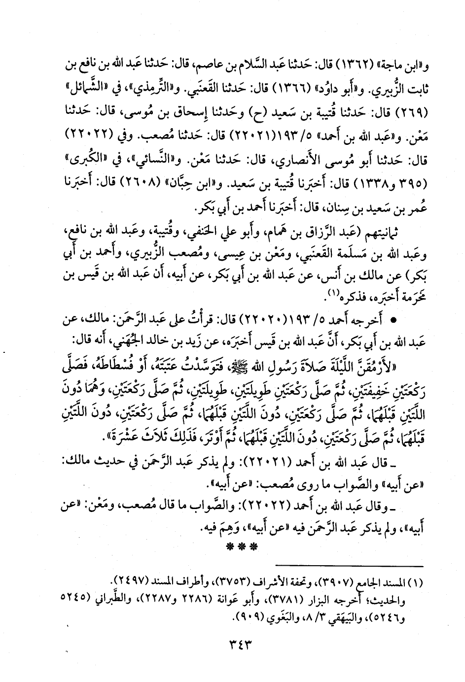 - قال عبد الله بن أحمد (٢٢٠٢١): ولم يذكر عبد الرَّحمَن في حديث مالك: «عن أبيه» والصواب ما روى مصعب: «عن أبيه».