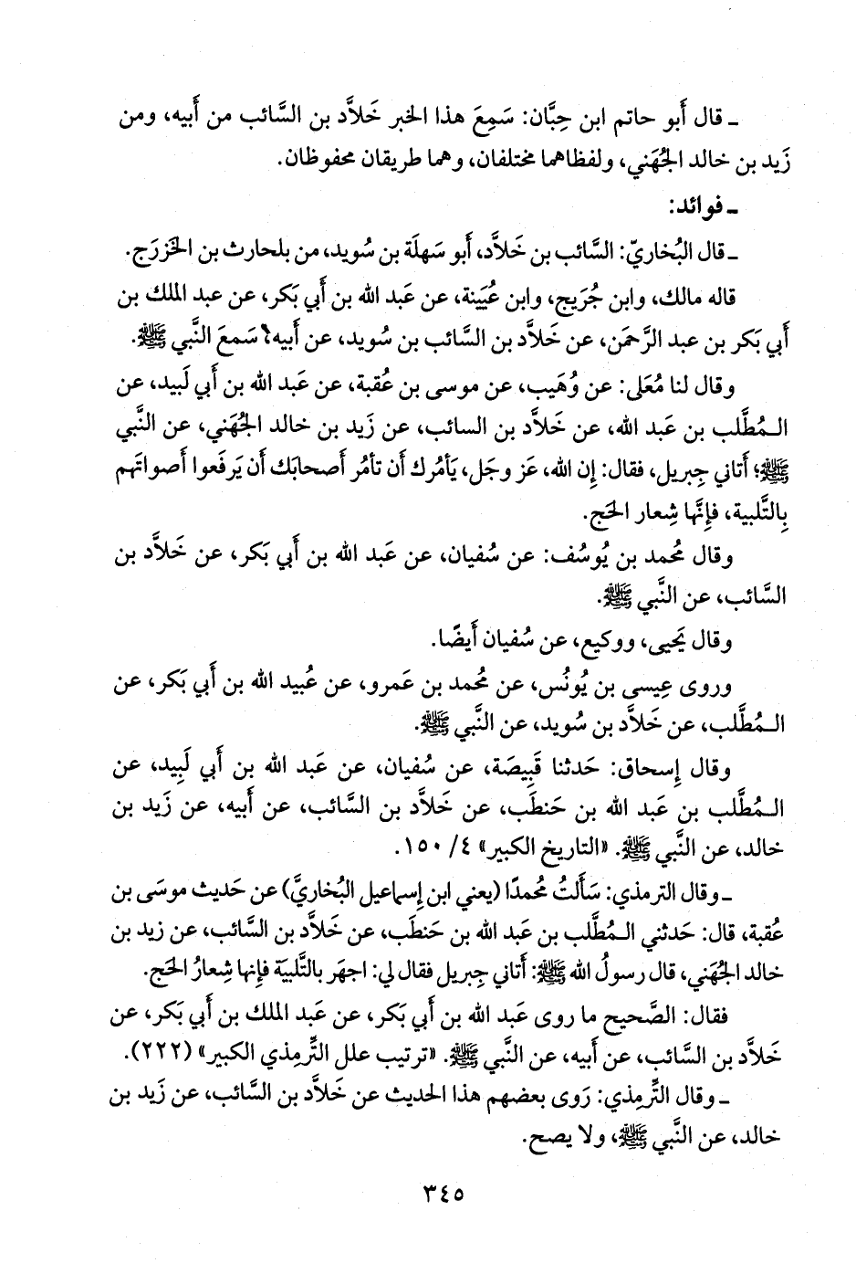 - وقال التِّرمِذي: سألتُ محمدًا، يعني ابن إسماعيل البخاري، عن حديث موسى بن عُقبة، قال: حدثني المطلب بن عبد الله بن حنطب، عن خلاد بن السائب، عن زيد بن خالد الجهني، قال رسول الله صَلى الله عَليه وسَلم: أتاني جبريل فقال لي: اجهر بالتلبية فإنها شعار الحج.