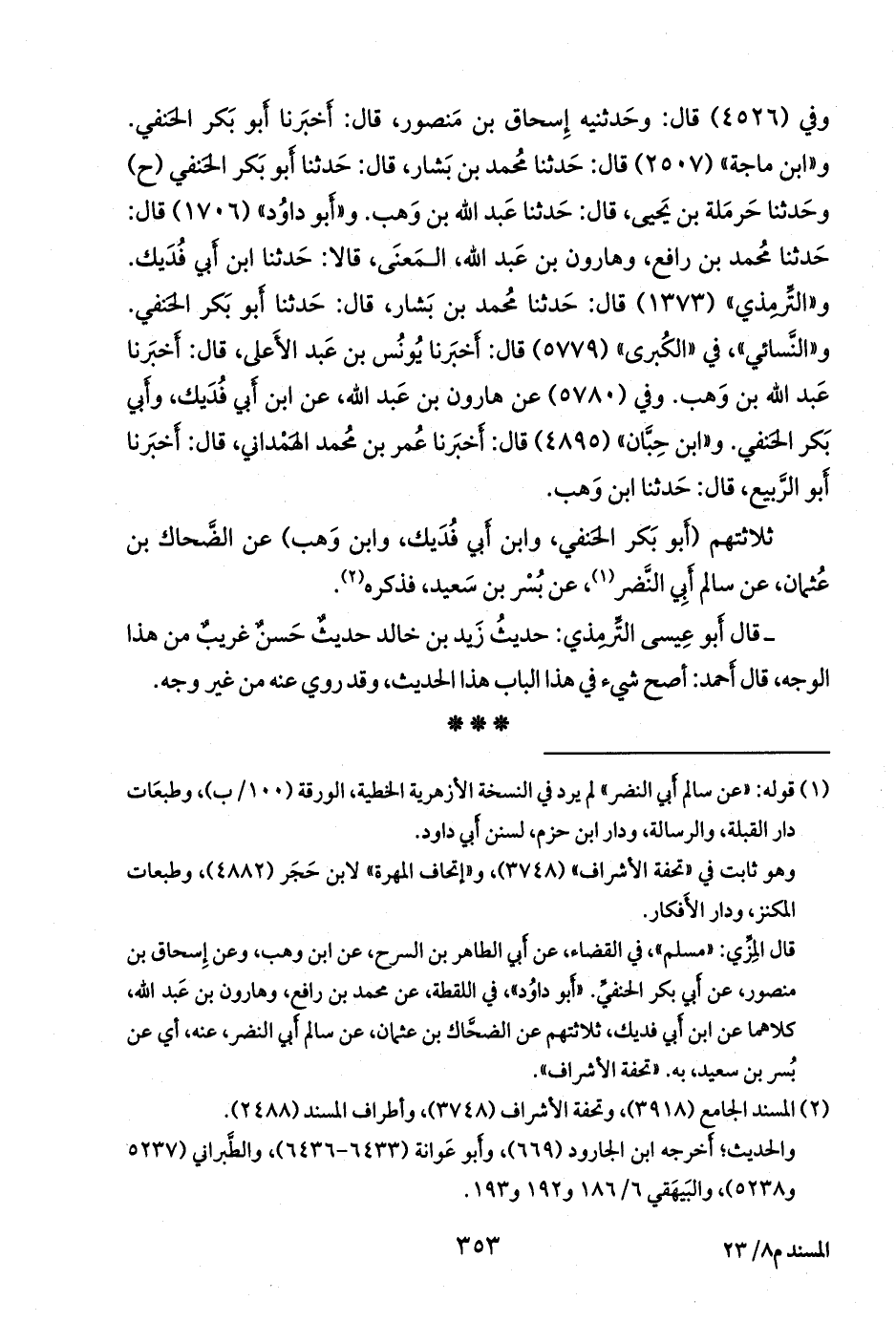 و «التِّرمِذي» (١٣٧٣) قال: حدثنا محمد بن بشار، قال: حدثنا أَبو بكر الحنفي. و «النَّسَائي» في «الكبرى» (٥٧٧٩) قال: أخبرنا يونس بن عبد الأعلى، قال: أخبرنا عبد الله بن وهب. وفي (٥٧٨٠) عن هارون بن عبد الله، عن ابن أبي فُديك، وأَبي بكر الحنفي. و «ابن حِبَّان» (٤٨٩٥) قال: أخبرنا عمر بن محمد الهمداني، قال: أخبرنا أَبو الربيع، قال: حدثنا ابن وهب.