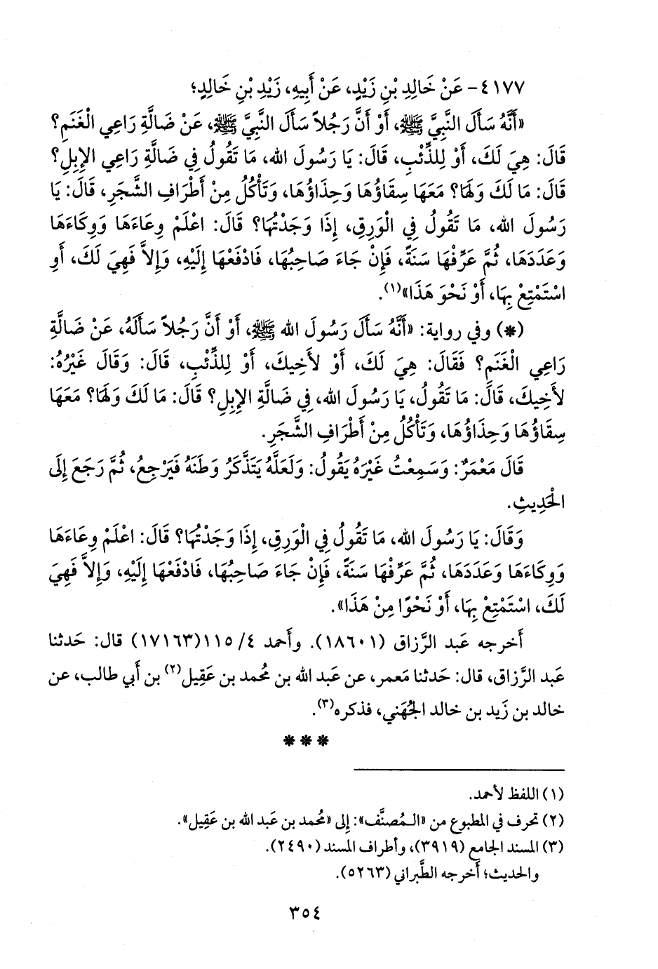 - وفي رواية: «أنه سأل رسول الله صَلى الله عَليه وسَلم أو أن رجلا سأله، عن ضالة راعي الغنم؟ فقال: هي لك، أو لأخيك، أو للذئب، قال: وقال غيره: لأخيك، قال: ما تقول، يا رسول الله، في ضالة الإبل؟ قال: ما لك ولها؟ معها سقاؤها وحذاؤها، وتأكل من أطراف الشجر.
