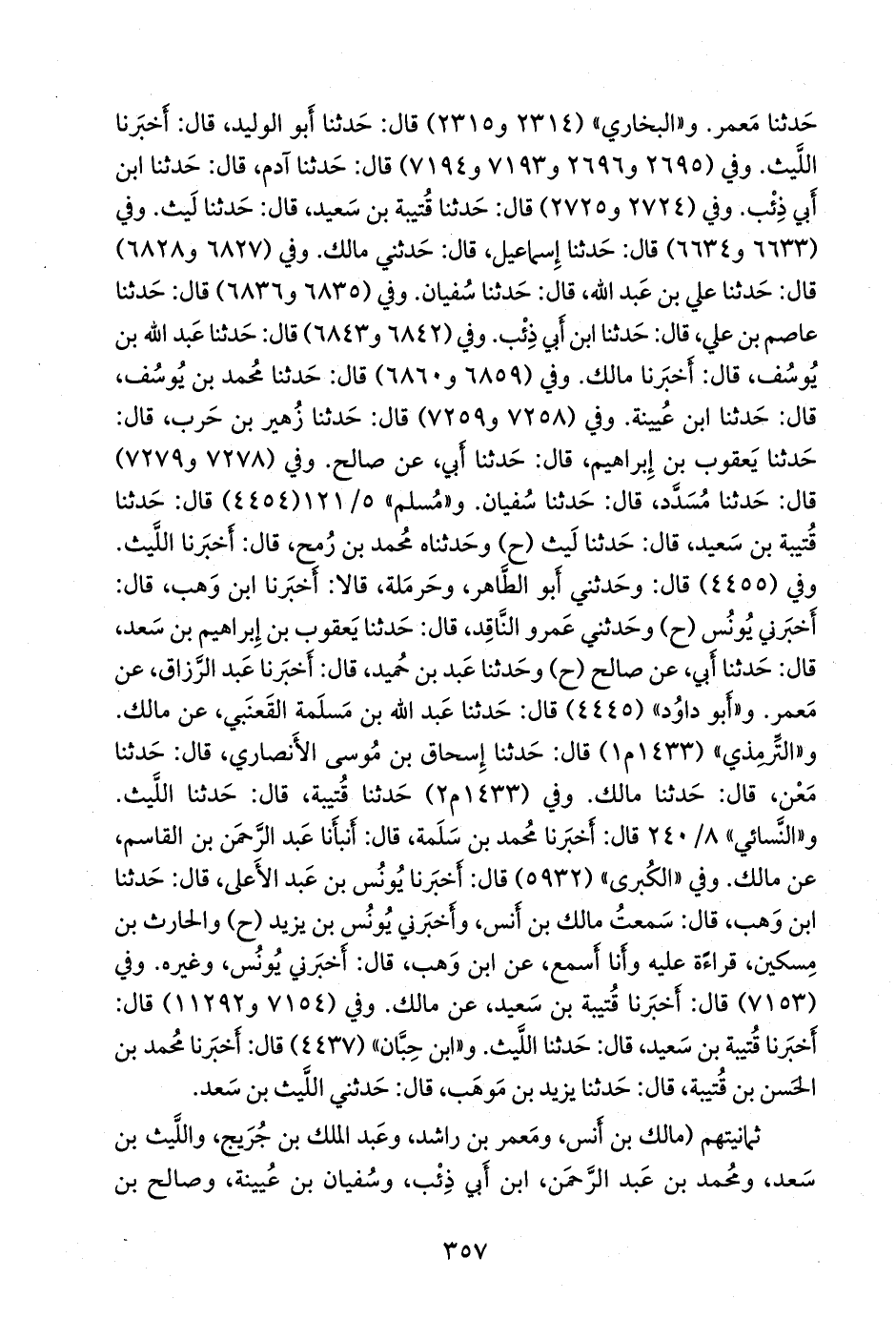 وفي (٤٤٥٥) قال: وحدثني أَبو الطاهر، وحَرملة، قالا: أخبرنا ابن وهب، قال: أخبرني يونس (ح) وحدثني عَمرو الناقد، قال: حدثنا يعقوب بن إبراهيم بن سعد، قال: حدثنا أبي، عن صالح (ح) وحدثنا عَبد بن حُميد، قال: أخبرنا عبد الرزاق، عن مَعمَر. و «أَبو داود» (٤٤٤٥) قال: حدثنا عبد الله بن مَسلَمة القَعنَبي، عن مالك. و «التِّرمِذي» (١٤٣٣ م ١) قال: حدثنا إسحاق بن موسى الأَنصاري، قال: حدثنا مَعْن، قال: حدثنا مالك. وفي (١٤٣٣ م ٢) قال: حدثنا قتيبة، قال: حدثنا الليث. و «النَّسَائي» ٨/ ٢٤٠ قال: أخبرنا محمد بن سلمة، قال: أنبأنا عبد الرَّحمَن بن القاسم، عن مالك. وفي «الكبرى» (٥٩٣٢) قال: أخبرنا يونس بن عبد الأعلى، قال: حدثنا ابن وهب، قال: سمعت مالك بن أنس، وأخبرني يونس بن يزيد (ح) والحارث بن مسكين، قراءة عليه وأنا أسمع، عن ابن وهب، قال: أخبرني يونس، وغيره. وفي (٧١٥٣) قال: أخبرنا قتيبة بن سعيد، عن مالك. وفي (٧١٥٤ و ١١٢٩٢) قال: أخبرنا قتيبة بن سعيد، قال: حدثنا الليث. و «ابن حِبَّان» (٤٤٣٧) قال: أخبرنا محمد بن الحسن بن قتيبة، قال: حدثنا يزيد بن مَوهَب، قال: حدثني الليث بن سعد.