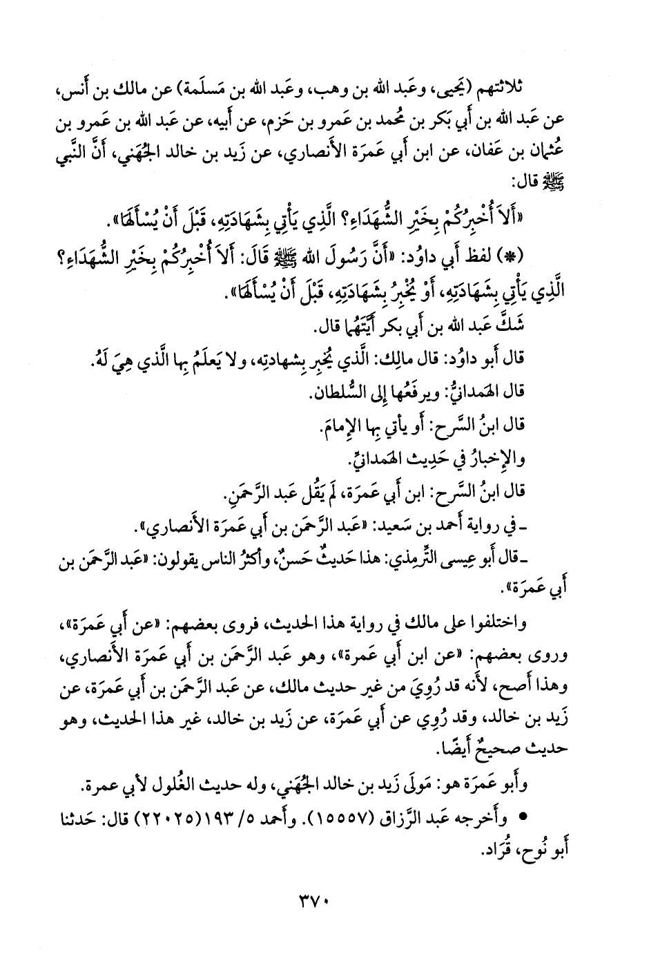 - لفظ أبي داود: «أن رسول الله صَلى الله عَليه وسَلم قال: ألا أخبركم بخير الشهداء؟ الذي يأتي بشهادته، أو يخبر بشهادته، قبل أن يسألها».