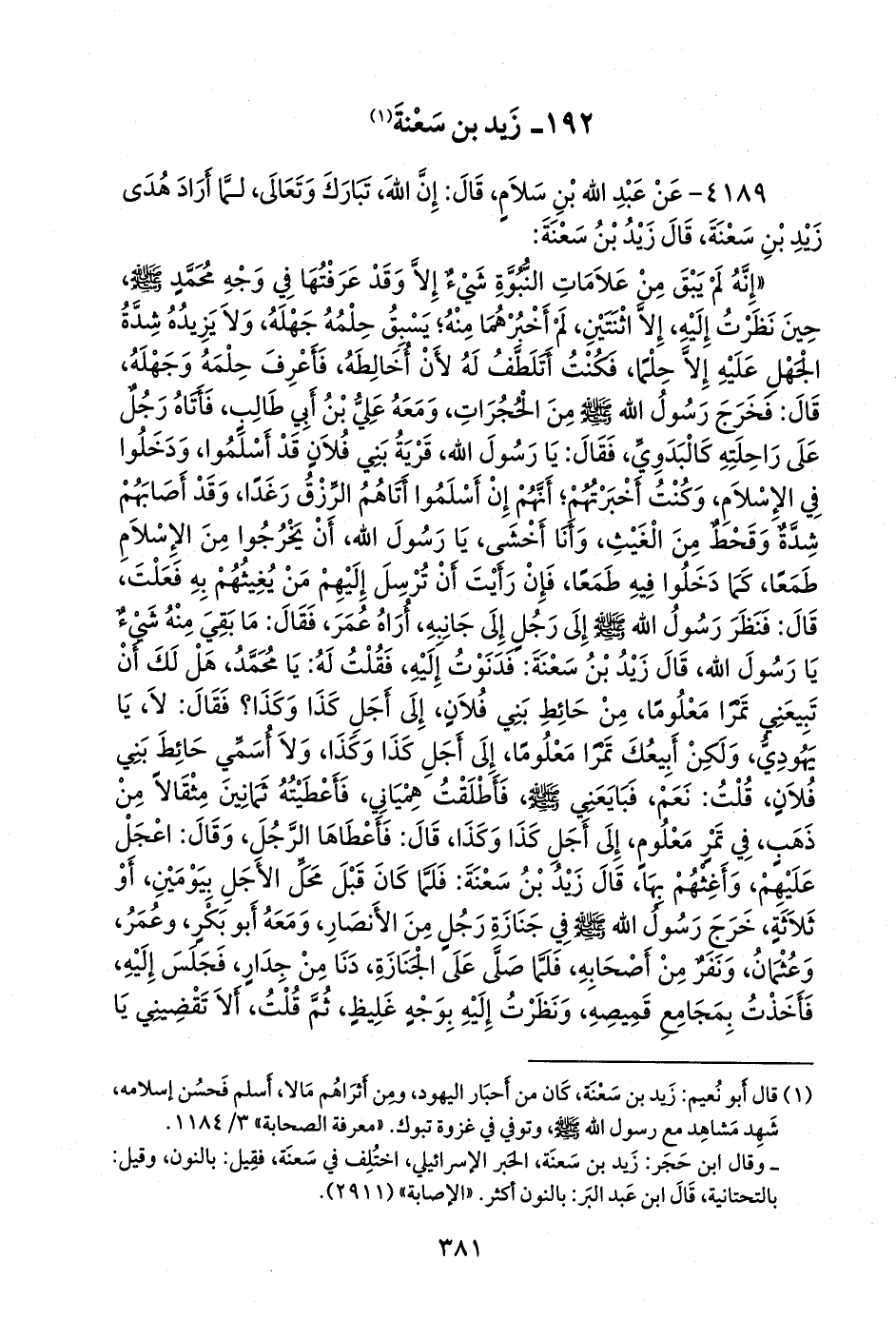 (¬١) قال أَبو نُعيم: زيد بن سعنة، كان من أحبار اليهود، ومن أثراهم مالا، أسلم فحسن إسلامه، شهد مشاهد مع رسول الله صَلى الله عَليه وسَلم وتوفي في غزوة تبوك» معرفة الصحابة» ٣/ ١١٨٤، وقال ابن حجر: زيد بن سعنة، الحبر الإسرائيلي، اختلف في سعنة، فقيل: بالنون، وقيل: بالتحتانية، قال ابن عبد البَر: بالنون أكثر. «الإصابة» (٢٩١١).