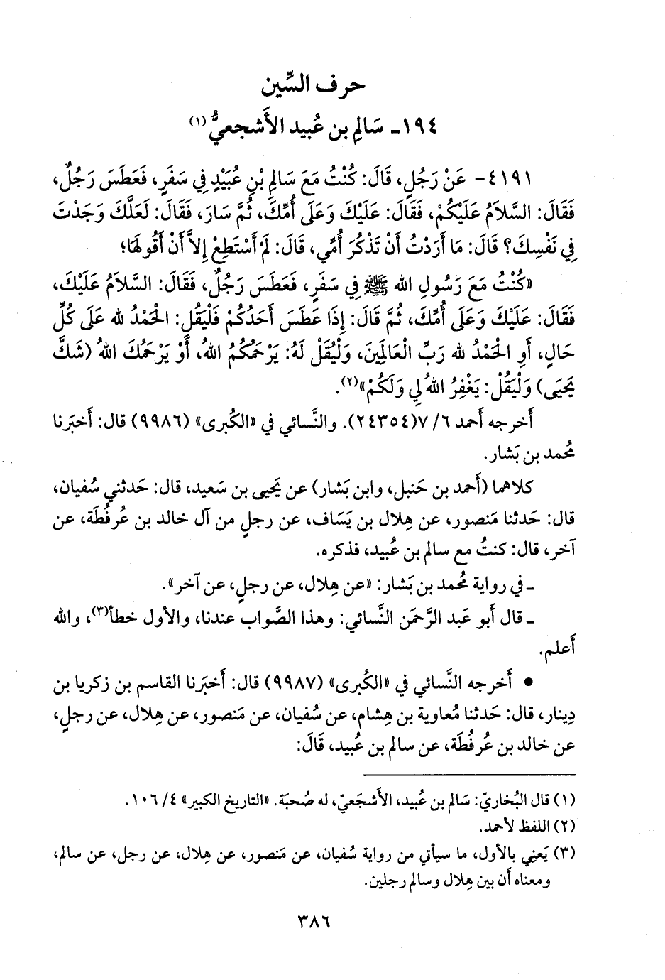 كلاهما (أحمد بن حنبل، وابن بشار) عن يحيى بن سعيد، قال: حدثني سفيان، قال: حدثنا منصور، عن هلال بن يَسَاف، عن رجل من آل خالد بن عُرفُطة، عن آخر، قال: كنت مع سالم بن عبيد، فذكره.