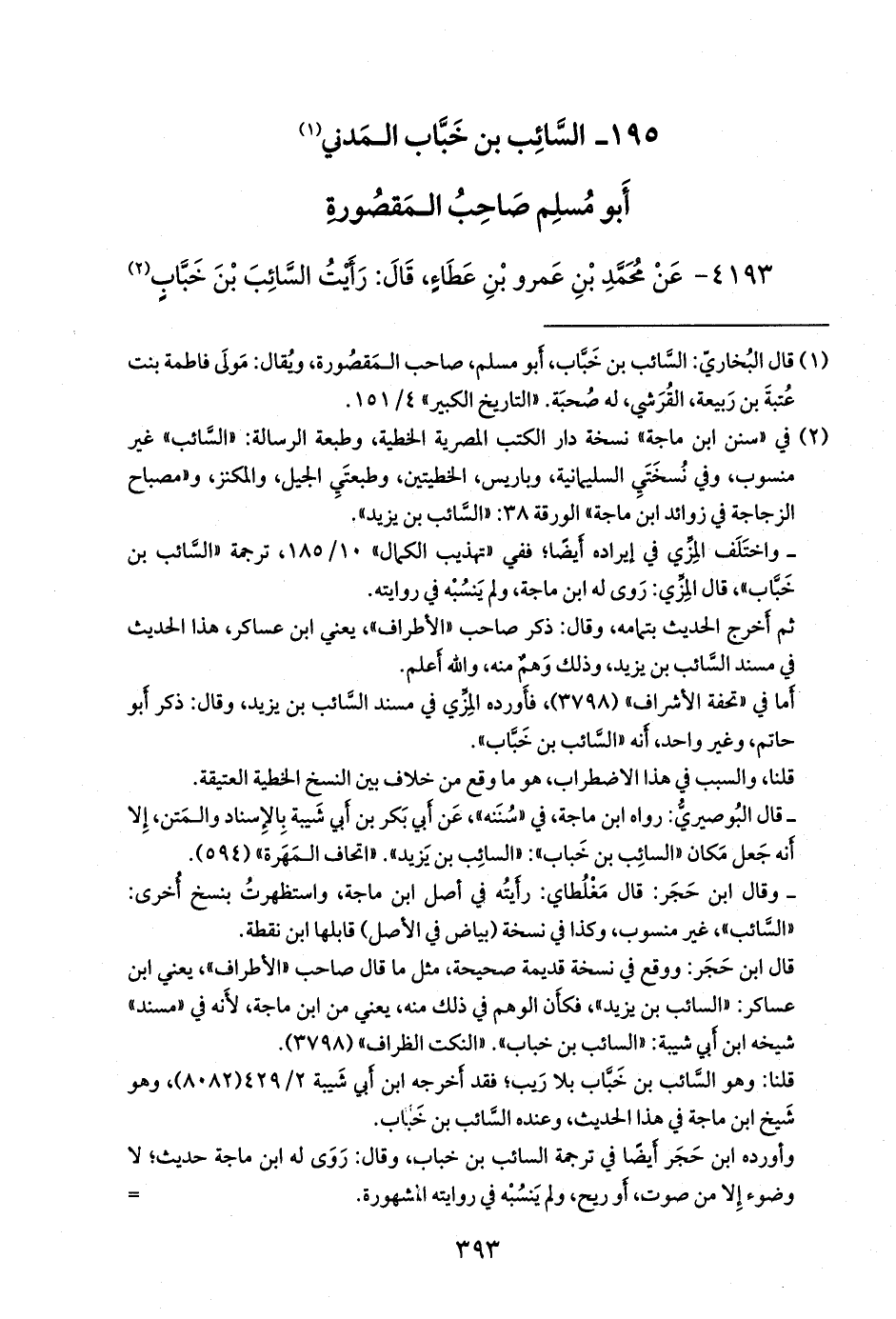 - وقال ابن حَجر: قال مَغلطاي: رأَيته في أصل ابن ماجة، واستظهرت بنسخ أُخرى: «السائب»، غير منسوب، وكذا في نسخة (بياض في الأصل) قابلها ابن نقطة.