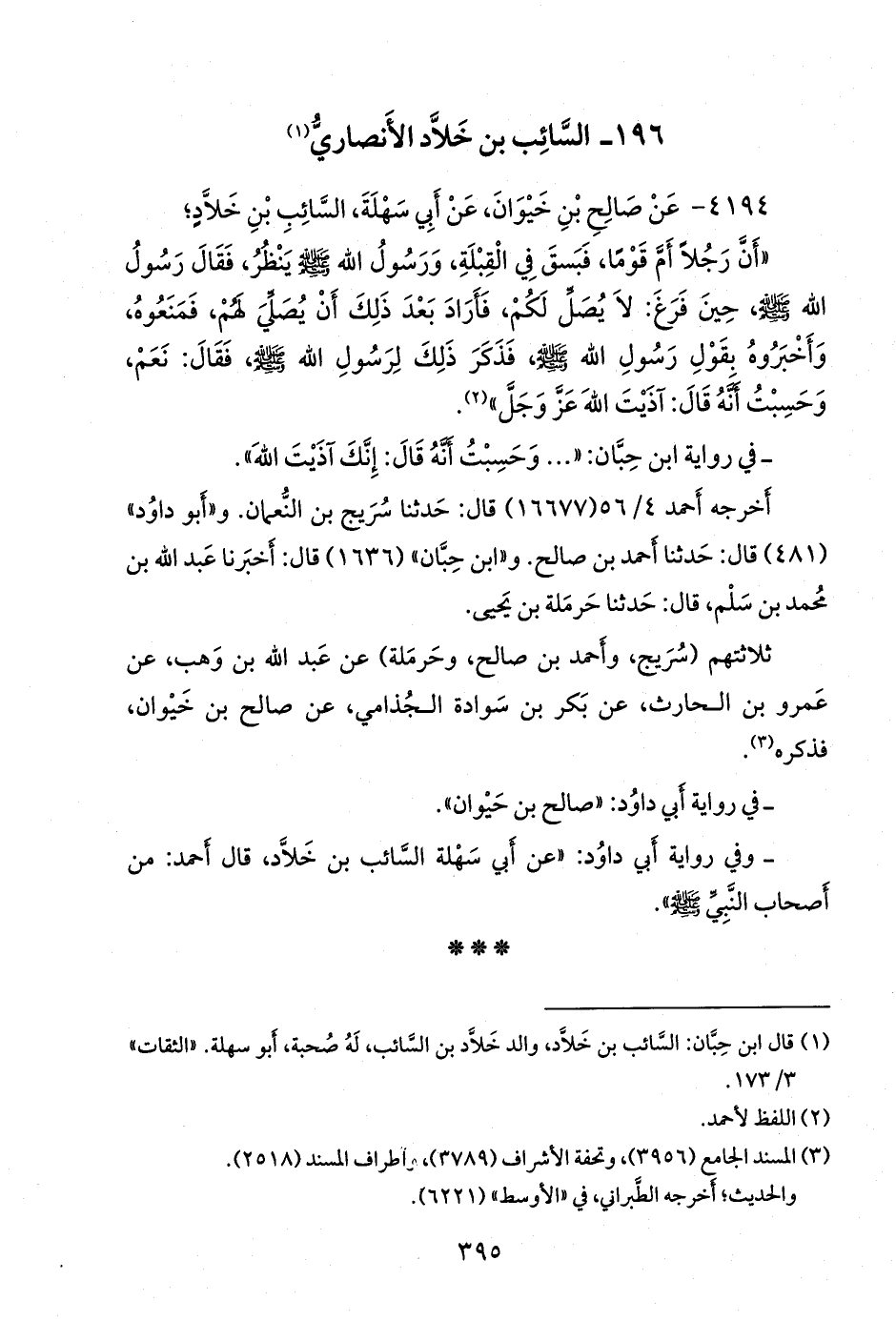 - وفي رواية أبي داود: «عن أبي سهلة السائب بن خلاد، قال أحمد: من أصحاب النبي صَلى الله عَليه وسَلم».